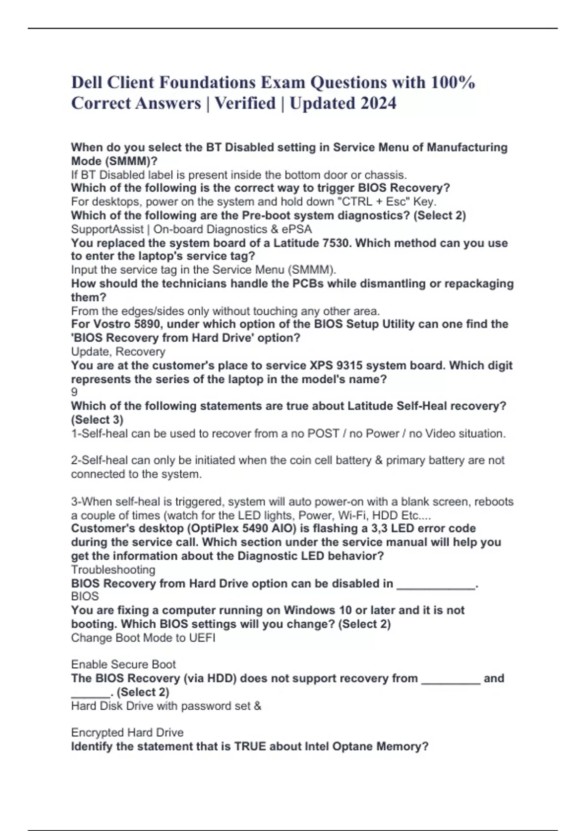 Dell Client Foundations Exam Questions with 100% Correct Answers | Verified | Updated 2024 When do you select the BT Disabled setting in Service Menu of Manufacturing Mode (SMMM)? If BT Disabled label is present inside the bottom door or chassis. Which of the following is the correct way to trigger BIOS Recovery? For desktops, power on the system and hold down "CTRL + Esc" Key. Which of the following are the Pre-boot system diagnostics? (Select 2) SupportAssist | On-board Diagnostics & ePSA You replaced the system board of a Latitude 7530. Which method can you use to enter the laptop's service tag? Input the service tag in the Service Menu (SMMM). How should the technicians handle the PCBs while dismantling or repackaging them? From the edges/sides only without touching any other area. For Vostro 5890, under which option of the BIOS Setup Utility can one find the 'BIOS Recovery from Hard Drive' option? Update, Recovery You are at the customer's place to service XPS 9315 system board. Which digit represents the series of the laptop in the model's name? 9 Which of the following statements are true about Latitude Self-Heal recovery? (Select 3) 1-Self-heal can be used to recover from a no POST / no Power / no Video situation. 2-Self-heal can only be initiated when the coin cell battery & primary battery are not connected to the system. 3-When self-heal is triggered, system will auto power-on with a blank screen, reboots a couple of times (watch for the LED lights, Power, Wi-Fi, HDD Etc.... Customer's desktop (OptiPlex 5490 AIO) is flashing a 3,3 LED error code during the service call. Which section under the service manual will help you get the information about the Diagnostic LED behavior? Troubleshooting BIOS Recovery from Hard Drive option can be disabled in ____________. BIOS You are fixing a computer running on Windows 10 or later and it is not booting. Which BIOS settings will you change? (Select 2) Change Boot Mode to UEFI Enable Secure Boot The BIOS Recovery (via HDD) does not support recovery from _________ and ______. (Select 2) Hard Disk Drive with password set & Encrypted Hard Drive Identify the statement that is TRUE about Intel Optane Memory?