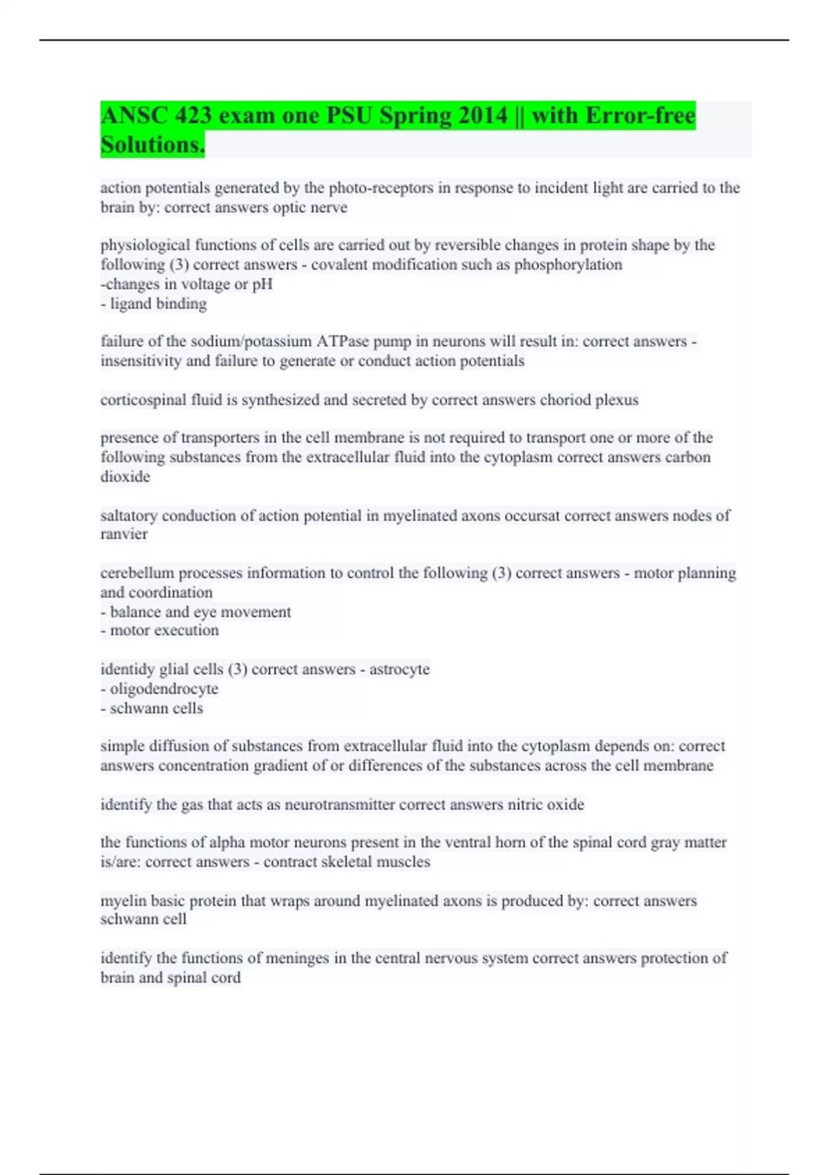 action potentials generated by the photo-receptors in response to incident light are carried to the brain by: correct answers optic nerve physiological functions of cells are carried out by reversible changes in protein shape by the following (3) correct answers - covalent modification such as phosphorylation -changes in voltage or pH - ligand binding failure of the sodium/potassium ATPase pump in neurons will result in: correct answers - insensitivity and failure to generate or conduct action potentials corticospinal fluid is synthesized and secreted by correct answers choriod plexus presence of transporters in the cell membrane is not required to transport one or more of the following substances from the extracellular fluid into the cytoplasm correct answers carbon dioxide saltatory conduction of action potential in myelinated axons occursat correct answers nodes of ranvier cerebellum processes information to control the following (3) correct answers - motor planning and coordination - balance and eye movement - motor execution identidy glial cells (3) correct answers - astrocyte - oligodendrocyte - schwann cells simple diffusion of substances from extracellular fluid into the cytoplasm depends on: correct answers concentration gradient of or differences of the substances across the cell membrane identify the gas that acts as neurotransmitter correct answers nitric oxide the functions of alpha motor neurons present in the ventral horn of the spinal cord gray matter is/are: correct answers - contract skeletal muscles myelin basic protein that wraps around myelinated axons is produced by: correct answers schwann cell identify the functions of meninges in the central nervous system correct answers protection of brain and spinal cord