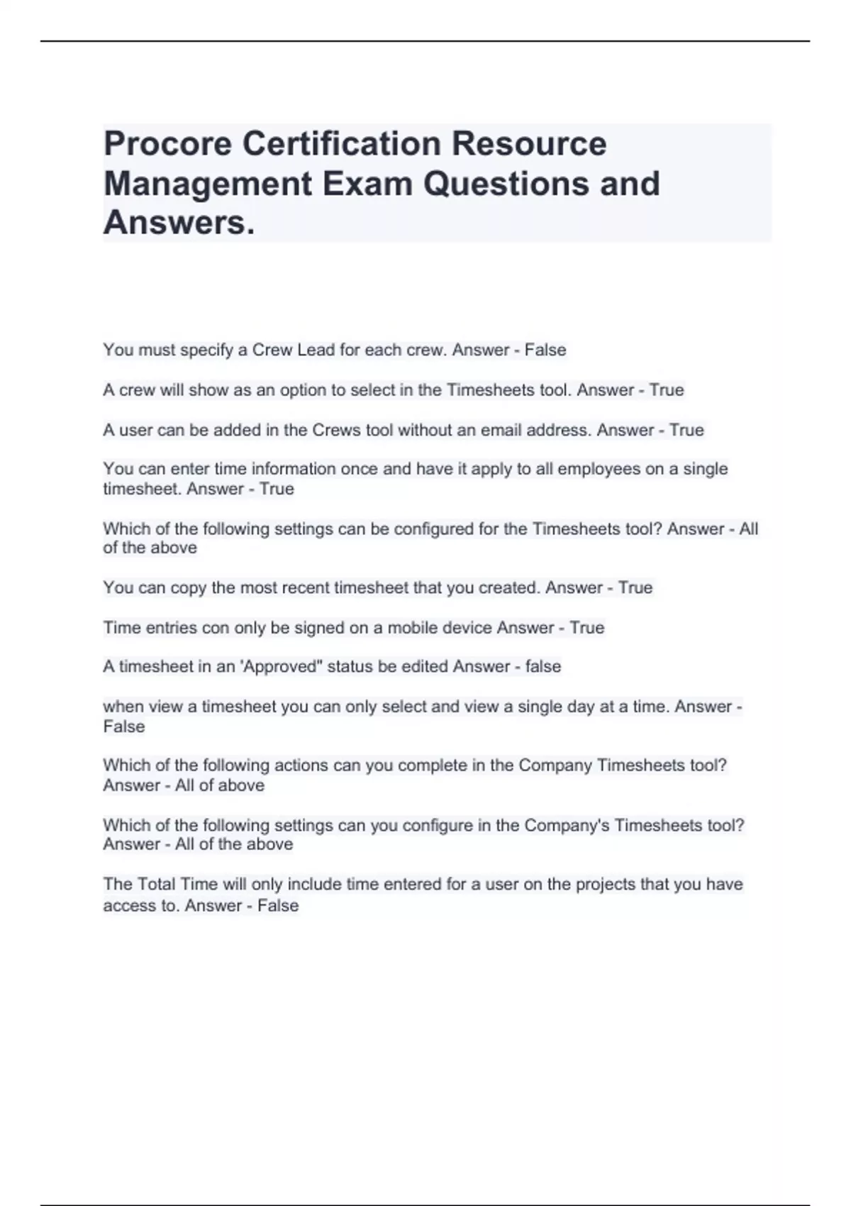 Procore Certification Resource Management Exam Questions and Answers