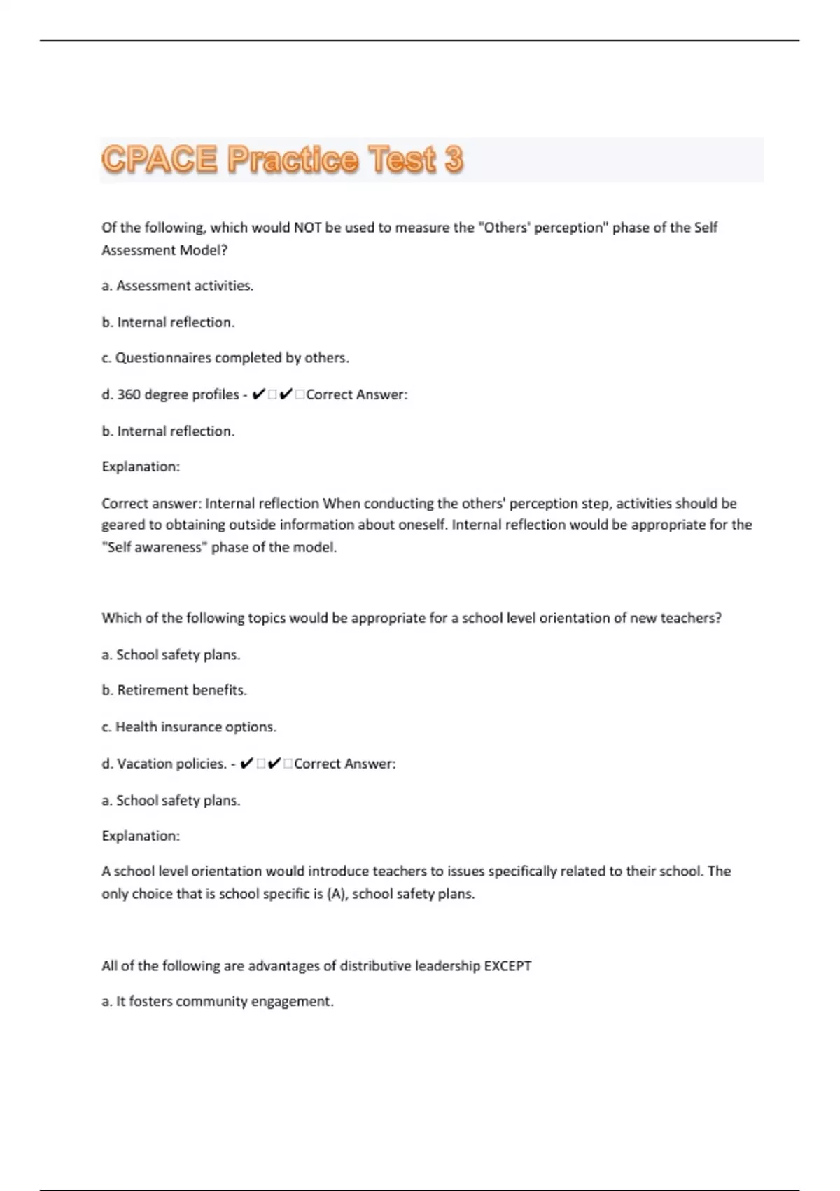 Of the following, which would NOT be used to measure the "Others' perception" phase of the Self Assessment Model? a. Assessment activities. b. Internal reflection. c. Questionnaires completed by others. d. 360 degree profiles - ️️Correct Answer: b. Internal reflection. Explanation: Correct answer: Internal reflection When conducting the others' perception step, activities should be geared to obtaining outside information about oneself. Internal reflection would be appropriate for the "Self awareness" phase of the model. Which of the following topics would be appropriate for a school level orientation of new teachers? a. School safety plans. b. Retirement benefits. c. Health insurance options. d. Vacation policies. - ️️Correct Answer: a. School safety plans. Explanation: A school level orientation would introduce teachers to issues specifically related to their school. The only choice that is school specific is (A), school safety plans.
