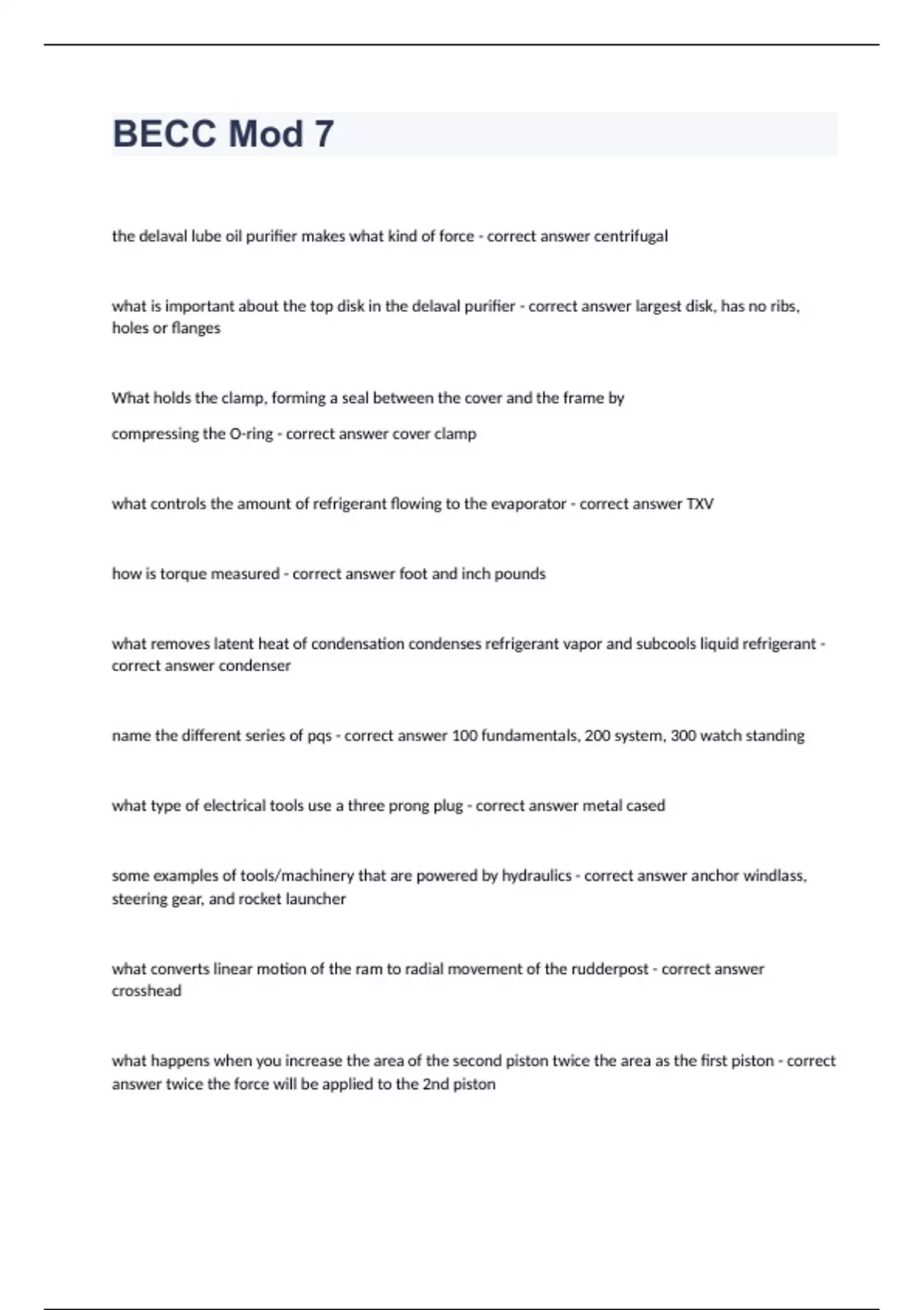 BECC Mod 7 Questions & Answers 2024. the delaval lube oil purifier makes what kind of force - correct answer centrifugal what is important about the top disk in the delaval purifier - correct answer largest disk, has no ribs, holes or flanges What holds the clamp, forming a seal between the cover and the frame by compressing the O-ring - correct answer cover clamp what controls the amount of refrigerant flowing to the evaporator - correct answer TXV how is torque measured - correct answer foot and inch pounds what removes latent heat of condensation condenses refrigerant vapor and subcools liquid refrigerant - correct answer condenser name the different series of pqs - correct answer 100 fundamentals, 200 system, 300 watch standing what type of electrical tools use a three prong plug - correct answer metal cased some examples of tools/machinery that are powered by hydraulics - correct answer anchor windlass, steering gear, and rocket launcher what converts linear motion of the ram to radial movement of the rudderpost - correct answer crosshead what happens when you increase the area of the second piston twice the area as the first piston - correct answer twice the force will be applied to the 2nd piston