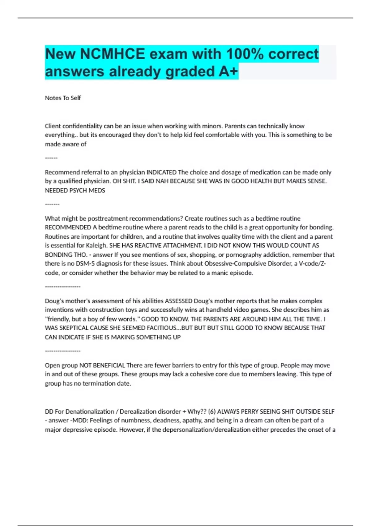 Notes To Self Client confidentiality can be an issue when working with minors. Parents can technically know everything.. but its encouraged they don't to help kid feel comfortable with you. This is something to be made aware of ------ Recommend referral to an physician INDICATED The choice and dosage of medication can be made only by a qualified physician. OH SHIT. I SAID NAH BECAUSE SHE WAS IN GOOD HEALTH BUT MAKES SENSE. NEEDED PSYCH MEDS ------- What might be posttreatment recommendations? Create routines such as a bedtime routine RECOMMENDED A bedtime routine where a parent reads to the child is a great opportunity for bonding. Routines are important for children, and a routine that involves quality time with the client and a parent is essential for Kaleigh. SHE HAS REACTIVE ATTACHMENT. I DID NOT KNOW THIS WOULD COUNT AS BONDING THO. If you see mentions of sex, shopping, or pornography addiction, remember that there is no DSM-5 diagnosis for these issues. Think about Obsessive-Compulsive Disorder, a V-code/Z-code, or consider whether the behavior may be related to a manic episode. ----------------- Doug's mother's assessment of his abilities ASSESSED Doug's mother reports that he makes complex inventions with construction toys and successfully wins at handheld video games. She describes him as "friendly, but a boy of few words." GOOD TO KNOW. THE PARENTS ARE AROUND HIM ALL THE TIME. I WAS SKEPTICAL CAUSE SHE SEEMED FACITIOUS...BUT BUT BUT STILL GOOD TO KNOW BECAUSE THAT CAN INDICATE IF SHE IS MAKING SOMETHING UP ----------------- Open group NOT BENEFICIAL There are fewer barriers to entry for this type of group. People may move in and out of these groups. These groups may lack a cohesive core due to members leaving. This type of group has no termination date. DD For Denationalization / Derealization disorder + Why?? (6) ALWAYS PERRY SEEING SHIT OUTSIDE SELF -MDD: Feelings of numbness, deadness, apathy, and being in a dream can often be part of a major depressive episode. However, if the depersonalization/derealization either precedes the onset of a major depressive episode or continues after the major depressive episode is resolved, then the diagnosis of Depersonalization/Derealization Disorder is appropriate. -Panic Disorder: Depersonalization/derealization is one of the symptoms that may occur during a panic attack, particularly as the severity increases. As such, Depersonalization/Derealization Disorder should not be diagnosed when the symptoms are the result of a panic attack that meets the criteria for the diagnosis of Panic Disorder. -Social Anxiety Disorder: Depersonalization/derealization is one of the symptoms that may occur during a panic attack, particularly as the severity increases. As such, Depersonalization/Derealization Disorder should not be diagnosed when the symptoms only occur during panic attacks associated with the fear of social situations as in Social Anxiety Disorder. -Specific Phobia: Depersonalization/derealization is one of the symptoms that may occur during a panic attack, particularly as the severity increases. As such, Depersonalization/Derealization Disorder should not be diagnosed when the symptoms only occur during panic attacks associated with the fear of an object or situation as in Specific Phobia. -Other Specified Mental Disorder Due to Another Medical Condition: differentiating factor in this case is that the dissociative symptoms are due to the direct physiological effects of a general medical condition. -Substance Intoxication: Substance Intoxication may be characterized by dissociative symptoms along with the other symptoms of Substance Intoxication such as impaired motor coordination, euphoria, anxiety, and impaired judgement. Schizophrenia 1) After how long can a therapist add a specifier for the diagnosis of Schizophrenia? 2) What good therapeutic TX can help treat Schizophrenia and why? (3) 3) Is amensia founded in Schziophrenia Specifiers with Schizophrenia 1) 1 year 2) Group therapy BENEFICIAL This can be a place for Darwin to practice social skills, normalize his experience, and discuss the appropriate use of medication. 3) Nope Notes to Self Homogeneous group BENEFICIAL Homogeneous groups have members with similar diagnostic backgrounds (for example, they may all suffer from depression). --------- FOR THE 1ST QUESTION... DONT BE TOO AFRAID TO CLICK ON A BUNCH OF SHIT. YOU'RE GATHERING INFO. --------- Bipolar I Disorder and Unspecified Alcohol Use Disorder INDICATED Based on Cathy's depression, excessive spending, impulsivity, binge drinking, and severe rages, this is the BEST answer. Further, her excessive use of alcohol (binge drinking) points to an unspecified alcohol use disorder. .. so yea... i know that it seemed all depressive... but you knew from the jump that rage and maxed out credit cards to not seem to be depressive episodes.. And excessive spending leads to what..... Implusivity. For ADHD, inattention is usually phrased and described as issues with task accomplishment. --------- Psychoeducational group NOT BENEFICIAL. MAY NOT BE DIRECT ENOUGH FOR SOME SHIT --------- Explore the idea of Brian receiving services through a VA hospital; perhaps he's not comfortable sharing his experience in war with a civilian therapist CHOSEN It seems he's very proud of being a soldier, and he may be more comfortable being treated by someone who understands where he has come from. I DIDNT CLICK THAT BECAUSE I THOUGHT THEY WOULD BE LIKE YOU SHOULD ****ING KEEP HIM... BUT WHEN I REREAD IT.. IT JUST SAYS EXPLORE... IT DOES NOT SAY "REFER OUT". DONT BE AFRAID TO BRING THAT UP DUE TO FEAR HE'LL BE UPSET... JUST BECAUSE YOU ARE "EXPLORING".. DONT THINK TOO DEEP MY LOVE. AND PLAYOUT WHAT MIGHT HAPPEN... JUST BE BASIC, BUT ATTENTIVE Conduct Disorder 1) How many codes/specifiers for this disorder? 2) What are they? 3) Is Schizophrenia a DD for Conduct + Why? Conduct Disorder 1) 3 2) Childhood-onset type (before age 10), Adolescent-onset type (not befo