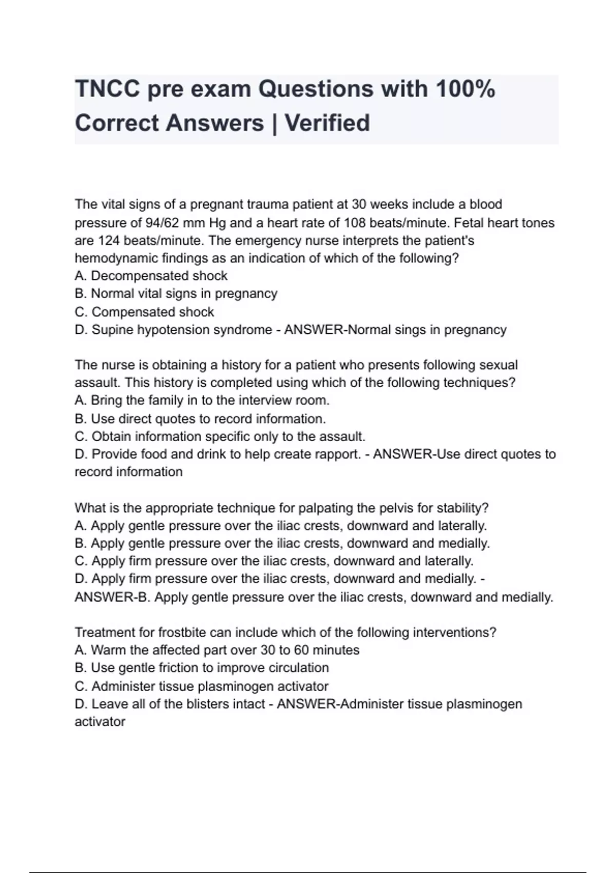 TNCC pre exam Questions with 100% Correct Answers | Verified The vital signs of a pregnant trauma patient at 30 weeks include a blood pressure of 94/62 mm Hg and a heart rate of 108 beats/minute. Fetal heart tones are 124 beats/minute. The emergency nurse interprets the patient's hemodynamic findings as an indication of which of the following? A. Decompensated shock B. Normal vital signs in pregnancy C. Compensated shock D. Supine hypotension syndrome - ANSWER-Normal sings in pregnancy The nurse is obtaining a history for a patient who presents following sexual assault. This history is completed using which of the following techniques? A. Bring the family in to the interview room. B. Use direct quotes to record information. C. Obtain information specific only to the assault. D. Provide food and drink to help create rapport. - ANSWER-Use direct quotes to record information What is the appropri