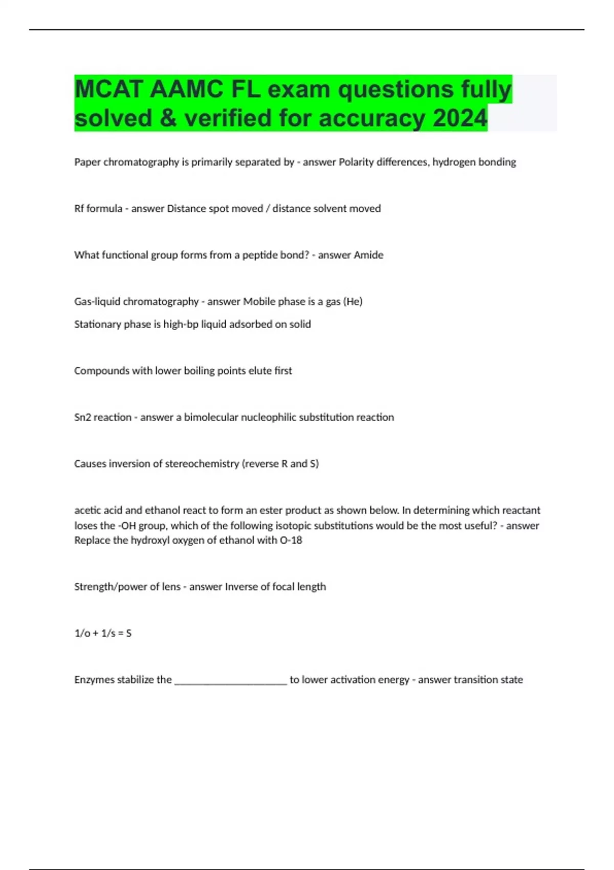 Paper chromatography is primarily separated by Polarity differences, hydrogen bonding Rf formula Distance spot moved / distance solvent moved What functional group forms from a peptide bond? Amide Gas-liquid chromatography Mobile phase is a gas (He) Stationary phase is high-bp liquid adsorbed on solid Compounds with lower boiling points elute first Sn2 reaction a bimolecular nucleophilic substitution reaction Causes inversion of stereochemistry (reverse R and S) acetic acid and ethanol react to form an ester product as shown below. In determining which reactant loses the -OH group, which of the following isotopic substitutions would be the most useful? Replace the hydroxyl oxygen of ethanol with O-18 Strength/power of lens Inverse of focal length 1/o + 1/s = S Enzymes stabilize the ____________________ to lower activation energy transition state Which of the following will decrease the percent ionization of 1.0 M acetic acid? Adding concentrated HCl Voltage formula V=IR Index of refraction n=c/v n1sinθ1 = n1sinθ2 Intensity Energy emitted per unit time Directly proportional to number of photons emitted Metric Prefixes Pico 10^-12 Nano 10^-9 Micro 10^-6 Milli 10^-3 Centi 10^-2 Deci 10^-1 Deka 10^1 Hecto 10^2 Kilo 10^3 Mega 10^6 Giga 10^9 Tera 10^12 Energy formula E = hf h = Planck's Constant 6.63x10^-34 J∙s f = c/λ c = fλ λ = c/f Glycogen synthase forms α 1,4 glycosidic bonds Branching enzyme forms α 1,6 glycosidic bonds