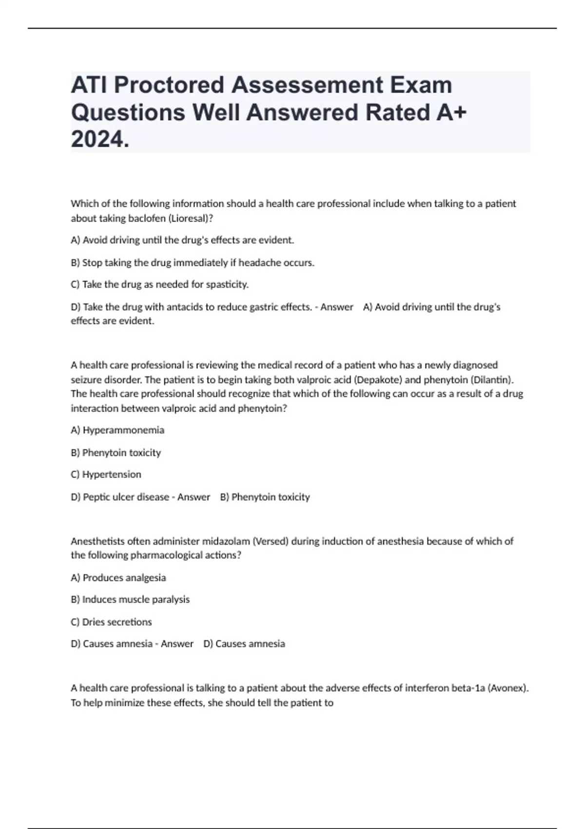 Which of the following information should a health care professional include when talking to a patient about taking baclofen (Lioresal)? A) Avoid driving until the drug's effects are evident. B) Stop taking the drug immediately if headache occurs. C) Take the drug as needed for spasticity. D) Take the drug with antacids to reduce gastric effects. - Answer A) Avoid driving until the drug's effects are evident. A health care professional is reviewing the medical record of a patient who has a newly diagnosed seizure disorder. The patient is to begin taking both valproic acid (Depakote) and phenytoin (Dilantin). The health care professional should recognize that which of the following can occur as a result of a drug interaction between valproic acid and phenytoin? A) Hyperammonemia B) Phenytoin toxicity C) Hypertension D) Peptic ulcer disease - Answer B) Phenytoin toxicity Anesthetists often administer midazolam (Versed) during induction of anesthesia because of which of the following pharmacological actions? A) Produces analgesia B) Induces muscle paralysis C) Dries secretions D) Causes amnesia - Answer D) Causes amnesia A health care professional is talking to a patient about the adverse effects of interferon beta-1a (Avonex). To help minimize these effects, she should tell the patient to