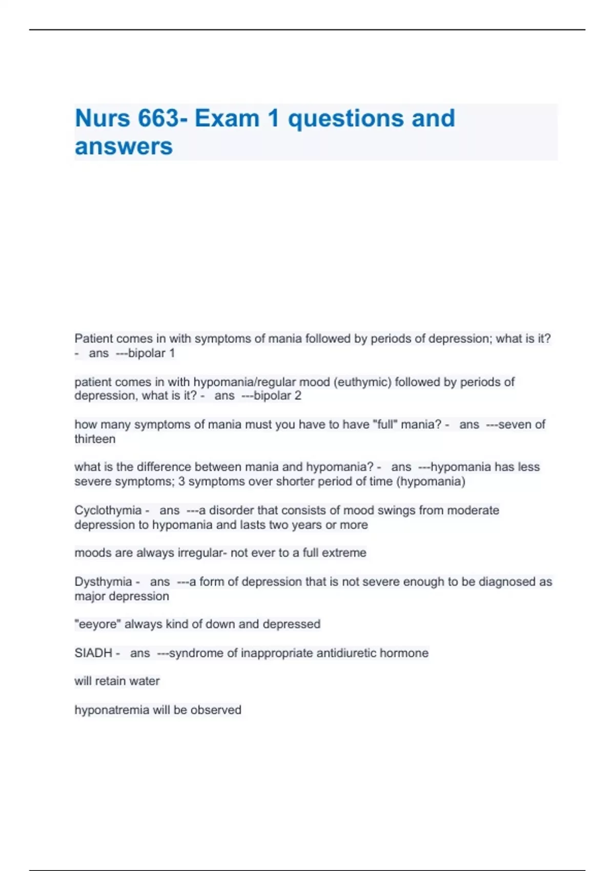 Patient comes in with symptoms of mania followed by periods of depression; what is it? - ans ---bipolar 1 patient comes in with hypomania/regular mood (euthymic) followed by periods of depression, what is it? - ans ---bipolar 2 how many symptoms of mania must you have to have "full" mania? - ans ---seven of thirteen what is the difference between mania and hypomania? - ans ---hypomania has less severe symptoms; 3 symptoms over shorter period of time (hypomania) Cyclothymia - ans ---a disorder that consists of mood swings from moderate depression to hypomania and lasts two years or more moods are always irregular- not ever to a full extreme Dysthymia - ans ---a form of depression that is not severe enough to be diagnosed as major depression "eeyore" always kind of down and depressed SIADH - ans ---syndrome of inappropriate antidiuretic hormone will retain water hyponatremia will be observed