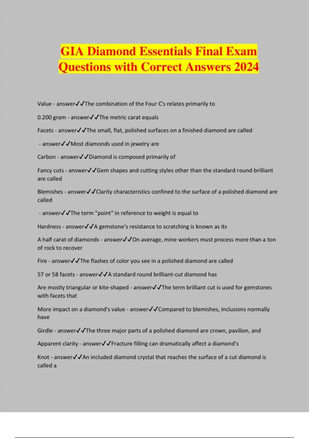 GIA Diamond Essentials Final Exam Questions with Correct Answers 2024 Value - answerThe combination of the Four C's relates primarily to 0.200 gram - answerThe metric carat equals Facets - answerThe small, flat, polished surfaces on a finished diamond are called - answerMost diamonds used in jewelry are Carbon - answerDiamond is composed primarily of Fancy cuts - answerGem shapes and cutting styles other than the standard round brilliant are called Blemishes - answerClarity characteristics confined to the surface of a polished diamond are called - answerThe term "point" in reference to weight is equal to Hardness - answerA gemstone's resistance to scratching is known as its A half carat of diamonds - answerOn average, mine workers must process more than a ton of rock to recover Fire - answerThe flashes of color you see in a polished diamond are called 57 or 58 facets - answerA standard round brilliant-cut diamond has Are mostly triangular or kite-shaped - answerThe term brilliant cut is used for gemstones with facets that More impact on a diamond's value - answerCompared to blemishes, inclusions normally have Girdle - answerThe three major parts of a polished diamond are crown, pavilion, and Apparent clarity - answerFracture filling can dramatically affect a diamond's Knot - answerAn included diamond crystal that reaches the surface of a cut diamond is called a Loupe - answerThe most convenient and inexpensive magnifier adequate for diamond grading is the Bearding - answerWhich of the following is a result of the