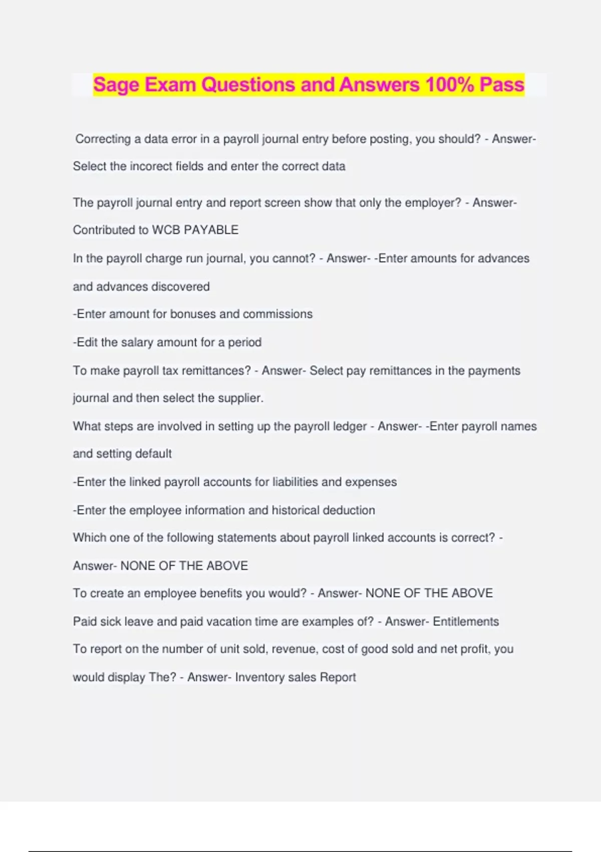 Sage Exam Questions and Answers 100% Pass Correcting a data error in a payroll journal entry before posting, you should? - Answer- Select the incorect fields and enter the correct data The payroll journal entry and report screen show that only the employer? - Answer- Contributed to WCB PAYABLE In the payroll charge run journal, you cannot? - Answer- -Enter amounts for advances and advances discovered -Enter amount for bonuses and commissions -Edit the salary amount for a period To make payroll tax remittances? - Answer- Select pay remittances in the payments journal and then select the supplier. What steps are involved in setting up the payroll ledger - Answer- -Enter payroll names and setting default -Enter the linked payroll accounts for liabilities and expenses -Enter the employee information and historical deduction Which one of the following statements about payroll linked accounts is correct? - Answer- NONE OF THE ABOVE To create an employee benefits you would? - Answer- NONE OF THE ABOVE Paid sick leave and paid vacation time are examples of? - Answer- Entitlements To report on the number of unit sold, revenue, cost of good sold and net profit, you would display The? - Answer- Inventory sales Report The best described inventory item linked accounts? - Answer- -When you purchase the item, the asset account is debited -When you sell the item, The revenue account is credited -When you sell the item, the cost of good sold account is debited When setting up a new inventory item that is combined from other items? - Answer- Set up an inventory ledger record, name the item, record the linked accounts When you see the message that a sale has caused one or more items to drop below the reorder point, you should? - Answer- Review the inventory quantity reports to see the items that you need to reorder When a division is set up and we enter a purchase, the allocate tool? - Answer- Will be highlights when an account that allows allocation is selected What is the rotal amount allocated from the entry shown? - Answer- $640.20