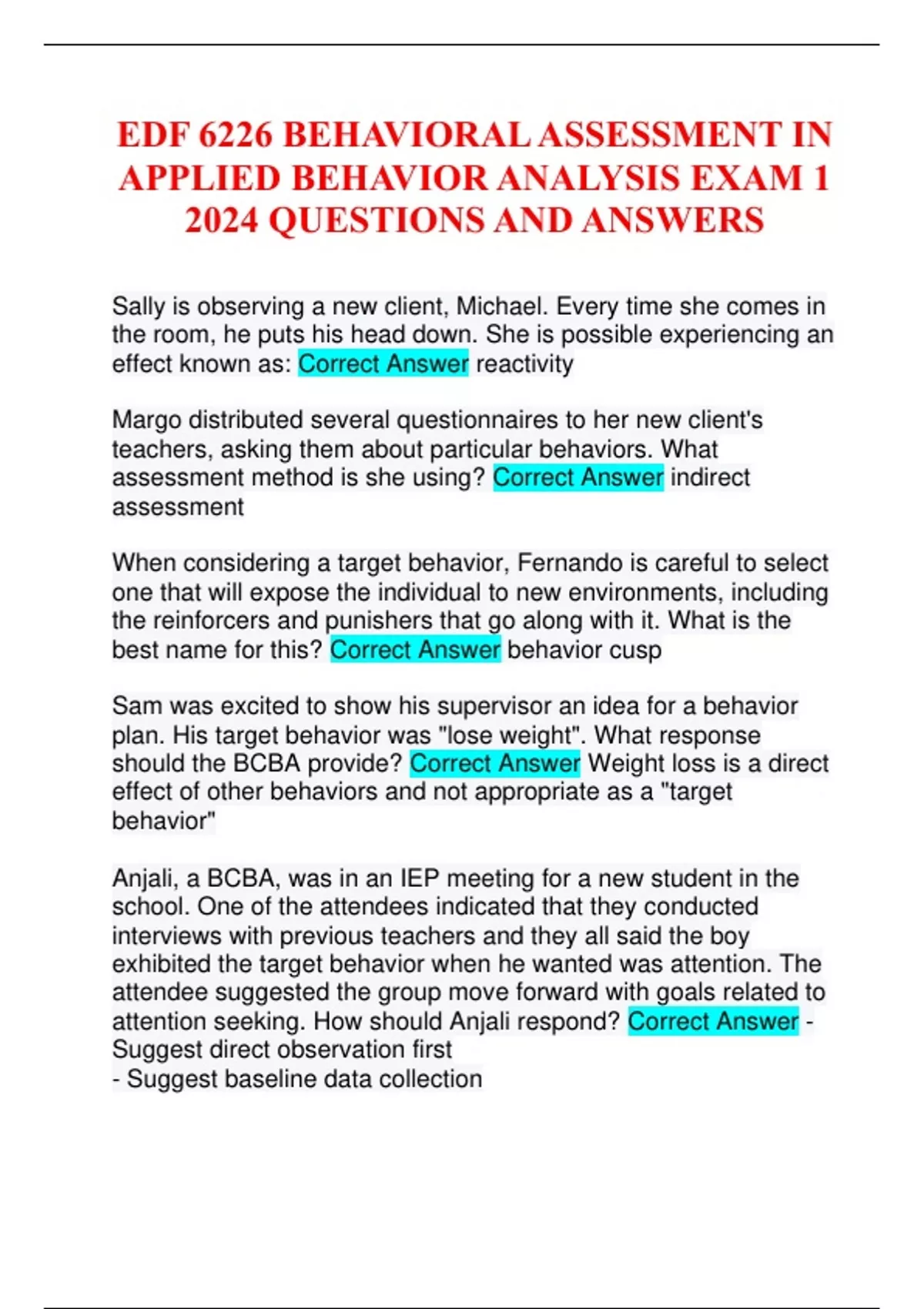 EDF 6226 BEHAVIORAL ASSESSMENT IN APPLIED BEHAVIOR ANALYSIS EXAM 1 2024 QUESTIONS AND ANSWERS