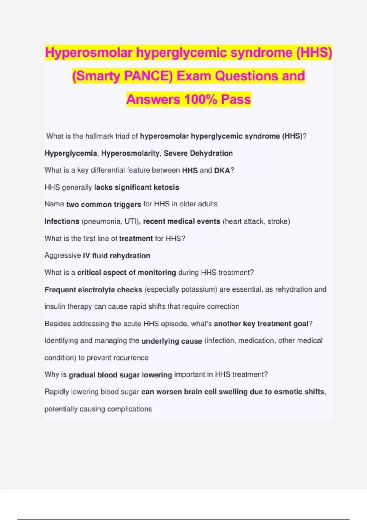 Hyperosmolar hyperglycemic syndrome (HHS) (Smarty PANCE) Exam Questions and Answers 100% Pass What is the hallmark triad of hyperosmolar hyperglycemic syndrome (HHS)? Hyperglycemia, Hyperosmolarity, Severe Dehydration What is a key differential feature between HHS and DKA? HHS generally lacks significant ketosis Name two common triggers for HHS in older adults Infections (pneumonia, UTI), recent medical events (heart attack, stroke) What is the first line of treatment for HHS? Aggressive IV fluid rehydration What is a critical aspect of monitoring during HHS treatment?