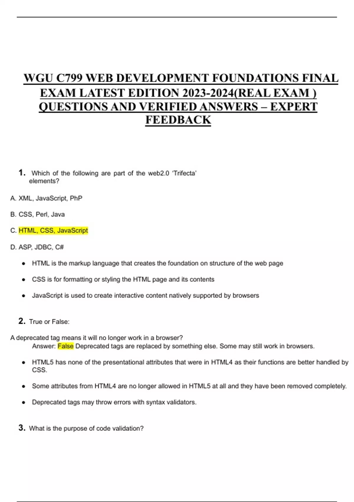 WGU C799 WEB DEVELOPMENT FOUNDATIONS FINAL EXAM LATEST EDITION (REAL EXAM ) QUESTIONS AND VERIFIED ANSWERS – EXPERT FEEDBACK LEGIT