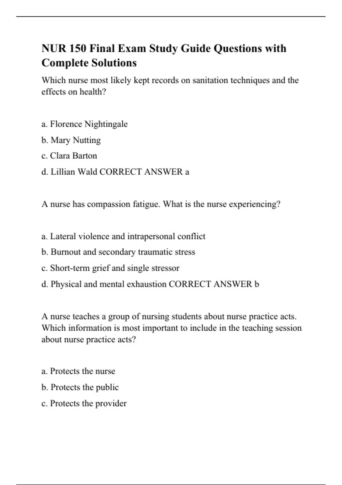 NUR 150 Final Exam Study Guide Questions with Complete Solutions