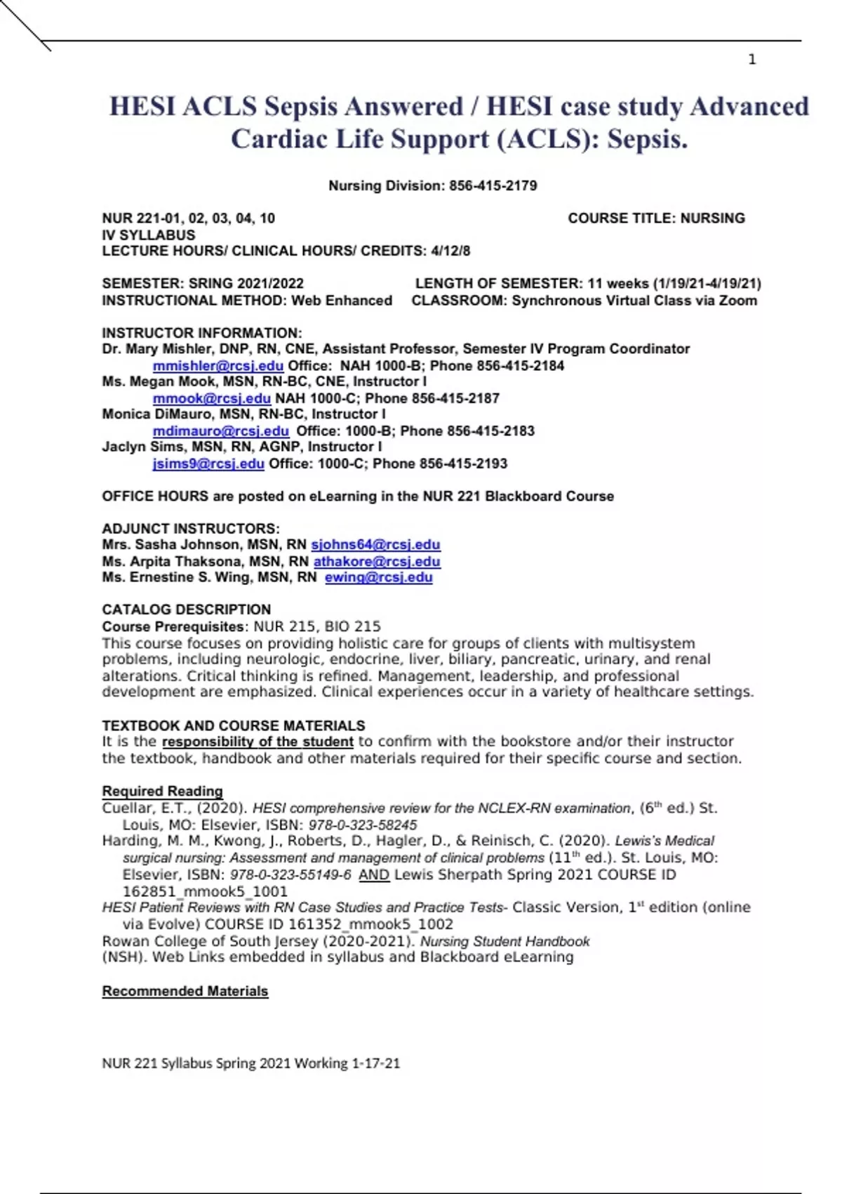 HESI ACLS Sepsis Answered / HESI case study Advanced Cardiac Life Support (ACLS): Sepsis. Nursing Division: NUR 221-01, 02, 03, 04, 10 COURSE TITLE: NURSING IV SYLLABUS LECTURE HOURS/ CLINICAL HOURS/ CREDITS: 4/12/8 SEMESTER: SRING 2021/2022 LENGTH OF SEMESTER: 11 weeks (1/19/21-4/19/21) INSTRUCTIONAL METHOD: Web Enhanced CLASSROOM: Synchronous Virtual Class via Zoom INSTRUCTOR INFORMATION: Dr. Mary Mishler, DNP, RN, CNE, Assistant Professor, Semester IV Program Coordinator Office: NAH 1000-B; Phone Ms. Megan Mook, MSN, RN-BC, CNE, Instructor I NAH 1000-C; Phone Monica DiMauro, MSN, RN-BC, Instructor I Office: 1000-B; Phone Jaclyn Sims, MSN, RN, AGNP, Instructor I Office: 1000-C; Phone 856-415-2193 OFFICE HOURS are posted on eLearning in the NUR 221 Blackboard Course ADJUNCT INSTRUCTORS: Mrs. Sasha Johnson, MSN, RN Ms. Arpita Thaksona, MSN, RN Ms. Ernestine S. Wing, MSN, RN CATALOG DESCRIPTION Course Prerequisites: NUR 215, BIO 215 This course focuses on providing holistic care for groups of clients with multisystem problems, including neurologic, endocrine, liver, biliary, pancreatic, urinary, and renal alterations. Critical thinking is refined. Management, leadership, and professional development are emphasized. Clinical experiences occur in a variety of healthcare settings. TEXTBOOK AND COURSE MATERIALS It is the responsibility of the student to confirm with the bookstore and/or their instructor the textbook, handbook and other materials required for their specific course and section. Required Reading Cuellar, E.T., (2020). HESI comprehensive review for the NCLEX-RN examination, (6th ed.) St. Louis, MO: Elsevier, ISBN: Harding, M. M., Kwong, J., Roberts, D., Hagler, D., & Reinisch, C. (2020). Lewis’s Medical surgical nursing: Assessment and management of clinical problems (11th ed.). St. Louis, MO: Elsevier, ISBN: 978-0-323-55149-6 AND Lewis Sherpath Spring 2021 COURSE ID 162851_mmook5_1001 HESI Patient Reviews with RN Case Studies and Practice Tests- Classic Version, 1st edition (online via Evolve) COURSE ID 161352_mmook5_1002 Rowan College of South Jersey (). Nursing Student Handbook (NSH). Web Links embedded in syllabus and Blackboard eLearning Recommended Materials Treas, L., Wilkinson, J., Barnett, K., Smith, & Smith, M. (2018): Basic Nursing: Thinking, Doing, and Caring, 2nd Edition. F.A. Davis. ISBN-10: 9780803659421 (NUR 131)* Martinez de Castillo, S. & Werner-McCullough, M. (n.d.) DosageCalc 360. F.A. Davis. ISBN- (NUR 130)* Vallerand, A. Sanoski, C. & Quiring, C. (2019): Davis’s Drug Guide, 16th Edition. F.A. Davis. ISBN-10: (NUR 131)* Wilkison, J., Treas, L., Barnett, K., & Smith, M. (n.d.). Davis’s Nursing Skills Videos. F.A. Davis. ISBN-13: 978-0-8036-6058-8 (NUR 130)* Please see current textbook prices at EVALUATION AND ASSESSMENT Grading Distribution Assessment Method Number of Items Percent of Grade Dosage Calculation Competency* 10 Pass/ Fail* Examination #1** 50 25% Examination #2** 50 25% Examination #3** 50 25% Final Examination – Cumulative** 100 25% Clinical Evaluation YOU MUST PASS CLINICAL to PASS THIS COURSE Pass/ Fail *YOU MUST PASS THE DOSAGE CALCULATION COMPETENCY WITH 100% ACCURACY (See NSH p. 34-36) **Only the average score of all 4 examinations is subject to rounding rules (see p. 6 of this syllabus). Note the additional Testing Policies outlined on pp. 10-14 of this syllabus and pp. 41-46 of the NSH. Grading Scale Final course grades are carried to the hundredth place, and are NOT ROUNDED. The grading scale in the Division of Nursing and Health Professions is final with NO ROUNDING and as follows (NSH, p. 40): A 91.5-100% B+ 88.5-91.49% B 83.5-88.49% C+ 80.5-83.49% C 75.5-80.49% You must have a minimum of a 75.5% average AND a Pass in clinical to pass this course (see NSH p. 16) D+ 72.5-75.49% D 69.5-72.49% F Below 69.49%, or Clinical Failure STUDENTS MUST EARN A GRADE OF “C” OR HIGHER TO PROGRESS IN THE NURSING CURRICULUM ROWAN COLLEGE SOUTH JERSEY COUNTY CORE COMPETENCIES (Based on the NJCC General Education Foundation - August 15, 2007; Revised 2014) This comprehensive list reflects the core competencies that are essential for all RCSJ graduates; however, each program varies regarding competencies required for a specific degree. Critical thinking is embedded in all courses, while teamwork and personal skills are embedded in many courses. 1 RCSJ Core Competencies Written and Oral Communication Students will communicate effectively in both speech and writing. 2 Quantitative Knowledge and Skills Students will use appropriate mathematical and statistical concepts and operations to interpret data and to solve problems. 3 Scientific Knowledge and Reasoning Students will use the scientific method of inquiry, through the acquisition of scientific knowledge. 4 Technological Competency Students will use computer systems or other appropriate forms of technology to achieve educational and personal goals. 5 Society and Human Behavior Students will use social science theories and concepts to analyze human behavior and social and political institutions and to act as responsible citizens. 6 Humanistic Perspective Students will analyze works in the fields of art, history, music, or theater; literature; philosophy and/or religious studies; and/or will gain competence in the use of a foreign language 7 Historical Perspective Students will understand historical events and movements in World, Western, non-Western or American societies and assess their subsequent significance. 8 Global and Cultural Awareness Students will understand the importance of a global perspective and culturally diverse peoples. 9 Ethical Reasoning and Action Students will understand ethical issues and situations. 10 Information Literacy Students will address an information need by locating, evaluating, and effectively using information NUR 221 CORE COMPETENCIES This course focuses on two of RCSJ’s Core Competencies: • Global and Cultural Awareness • Ethical Reasoning and Action S