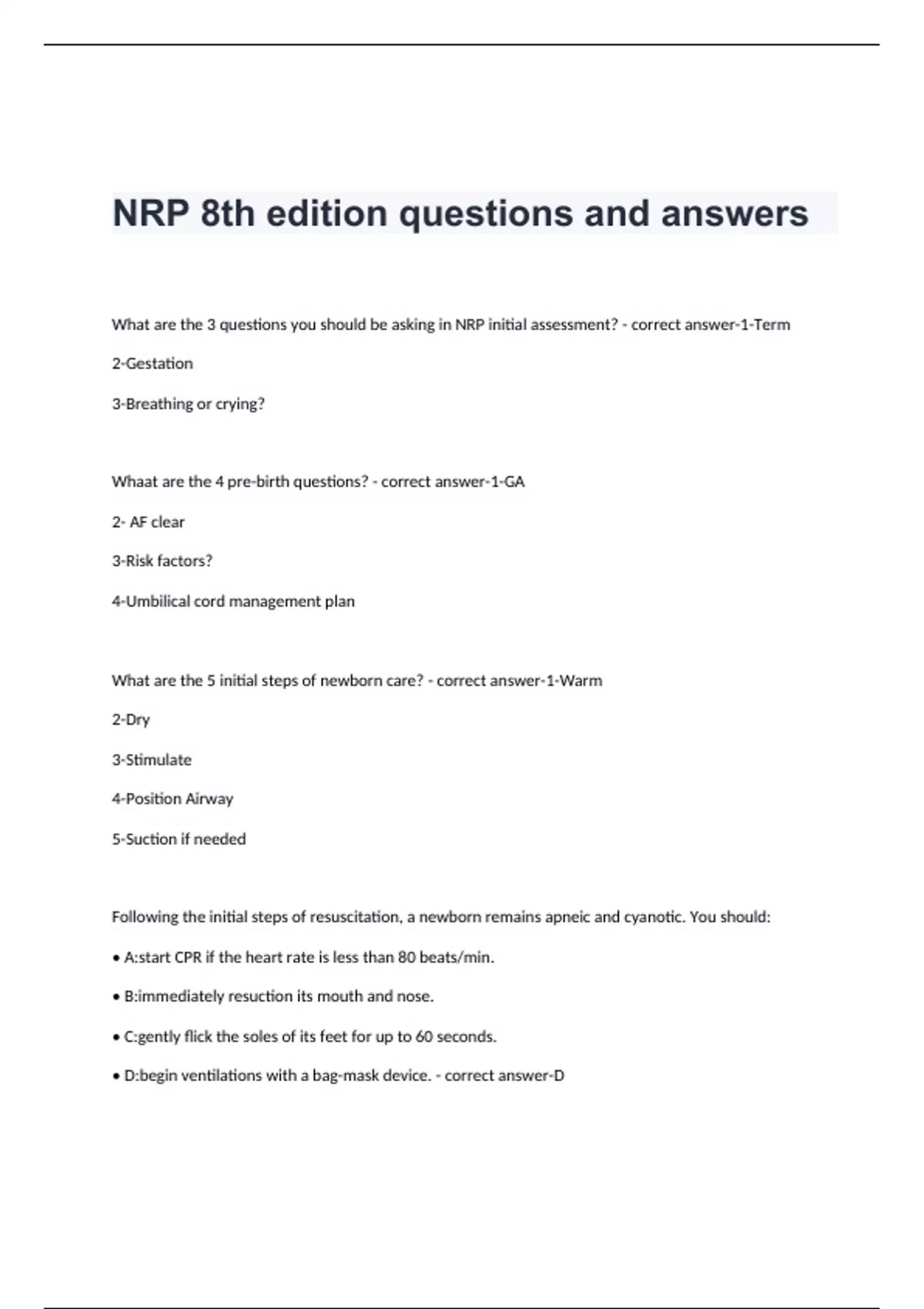 What are the 3 questions you should be asking in NRP initial assessment? - correct answer-1-Term 2-Gestation 3-Breathing or crying? Whaat are the 4 pre-birth questions? - correct answer-1-GA 2- AF clear 3-Risk factors? 4-Umbilical cord management plan What are the 5 initial steps of newborn care? - correct answer-1-Warm 2-Dry 3-Stimulate 4-Position Airway 5-Suction if needed Following the initial steps of resuscitation, a newborn remains apneic and cyanotic. You should: • A:start CPR if the heart rate is less than 80 beats/min. • B:immediately resuction its mouth and nose. • C:gently flick the soles of its feet for up to 60 seconds. • D:begin ventilations with a bag-mask device. - correct answer-D