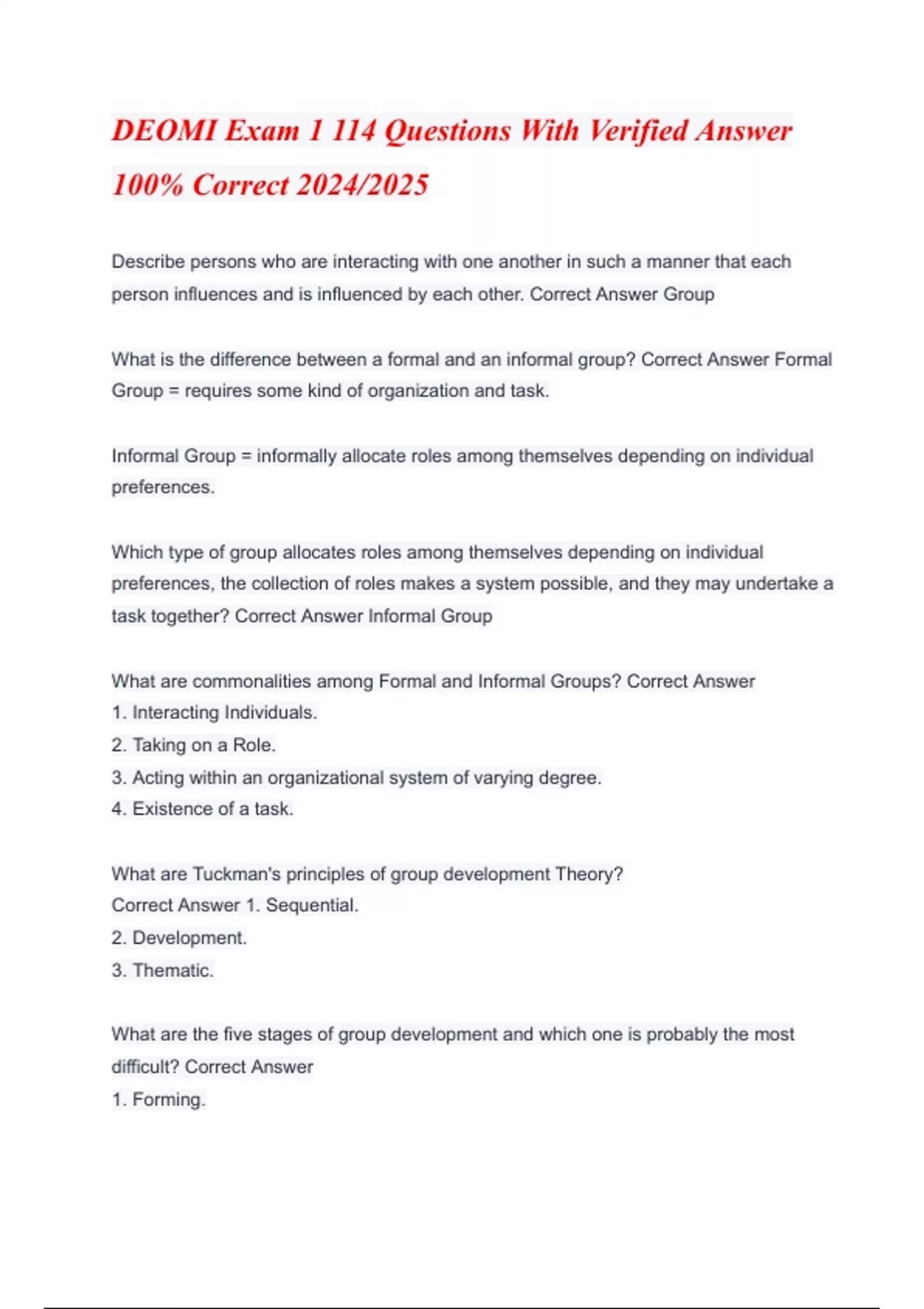DEOMI Exam 1 114 Questions With Verified Answer 100% Correct 2024/2025 Describe persons who are interacting with one another in such a manner that each person influences and is influenced by each other. Correct Answer Group What is the difference between a formal and an informal group? Correct Answer Formal Group = requires some kind of organization and task. Informal Group = informally allocate roles among themselves depending on individual preferences. Which type of group allocates roles among themselves depending on individual preferences, the collection of roles makes a system possible, and they may undertake a task together? Correct Answer Informal Group What are commonalities among Formal and Informal Groups? Correct Answer 1. Interacting Individuals. 2. Taking on a Role. 3. Acting within an organizational system of varying degree. 4. Existence of a task. What are Tuckman's principles of group development Theory? Correct Answer 1. Sequential. 2. Development. 3. Thematic. What are the five stages of group development and which one is probably the most difficult? Correct Answer 1. Forming. 2. Storming (the most difficult). 3. Norming. 4. Performing. 5. Adjourning. What are the characteristics associated with the forming stage of group development? Correct Answer Initially polite and superficial as each person seeks out similarities or common needs. Why is the storming stage sometimes the most difficult stage of group development? Correct Answer Group members realize the task is different and more difficult than they imagined. What are the two types of norms that are used within groups? Correct Answer General & Role Specific. What is the difference between formal and informal Rules? Correct Answer Formal are written rules and Informal Rules do not specify absolute or self-imposed norms. What are the three basic needs that motivate people according to McClelland's Needs Theory? Correct Answer 1. Achievement. 2. Affiliation. 3. Power. What are the characteristics associated with needs based on achievement? Correct Answer Welcomes challenges, Wants ensured success, has conservative goals, Plans ahead, Takes personal responsibility, needs hard data reinforcement. What are the characteristics associated with Affiliation needs? Correct Answer 1. Establishes/maintains relationships. 2. Approval needs may affect decision making/implementation.