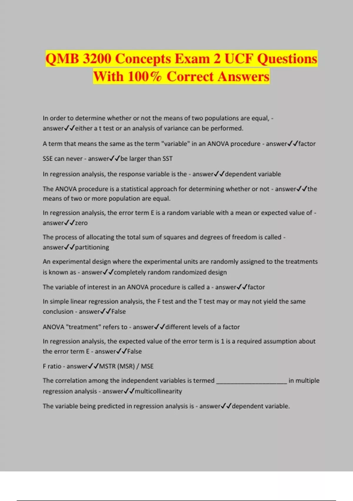 qmb 3200 concepts exam 2 ucf questions with 100 c