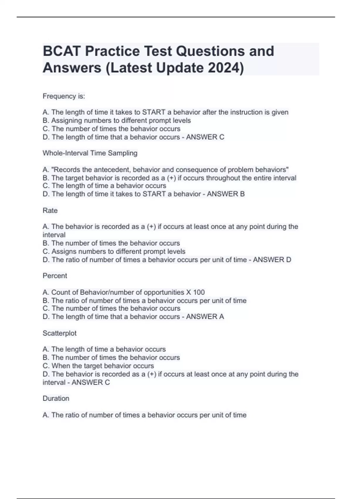 Frequency is: A. The length of time it takes to START a behavior after the instruction is given B. Assigning numbers to different prompt levels C. The number of times the behavior occurs D. The length of time that a behavior occurs - ANSWER C Whole-Interval Time Sampling A. "Records the antecedent, behavior and consequence of problem behaviors" B. The target behavior is recorded as a (+) if occurs throughout the entire interval C. The length of time a behavior occurs D. The length of time it takes to START a behavior - ANSWER B Rate A. The behavior is recorded as a (+) if occurs at least once at any point during the interval B. The number of times the behavior occurs C. Assigns numbers to different prompt levels D. The ratio of number of times a behavior occurs per unit of time - ANSWER D Percent A. Count of Behavior/number of opportunities X 100 B. The ratio of number of times a behavior occurs per unit of time C. The number of times the behavior occurs D. The length of time that a behavior occurs - ANSWER A Scatterplot A. The length of time a behavior occurs B. The number of times the behavior occurs C. When the target behavior occurs D. The behavior is recorded as a (+) if occurs at least once at any point during the interval - ANSWER C Duration A. The ratio of number of times a behavior occurs per unit of time B. The length of time it takes to START a behavior after the instruction is given" C. The number of times the behavior occurs D. The length of time a behavior occurs - ANSWER D Partial Interval Time Sampling A. The behavior is recorded as a (+) if occurs at least once at any point during the interval B. The target behavior is recorded as a (+) if occurs throughout the entire interval C. The time it takes to START a behavior after the instruction is given D. The number of times a behavior occurs - ANSWER A Scratching a bug bite is an example of negative reinforcement