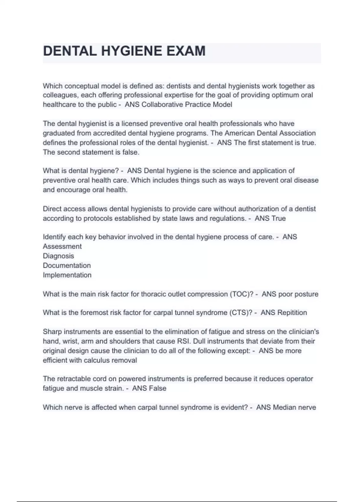 DENTAL HYGIENE EXAM with Questions And 100% Verified Answers