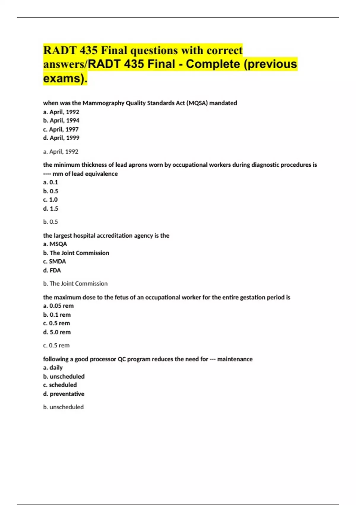 RADT 435 Final questions with correct answers/RADT 435 Final - Complete (previous exams). when was the Mammography Quality Standards Act (MQSA) mandated a. April, 1992 b. April, 1994 c. April, 1997 d. April, 1999 a. April, 1992 the minimum thickness of lead aprons worn by occupational workers during diagnostic procedures is ---- mm of lead equivalence a. 0.1 b. 0.5 c. 1.0 d. 1.5 b. 0.5 the largest hospital accreditation agency is the a. MSQA b. The Joint Commission c. SMDA d. FDA b. The Joint Commission the maximum dose to the fetus of an occupational worker for the entire gestation period is a. 0.05 rem b. 0.1 rem c. 0.5 rem d. 5.0 rem c. 0.5 rem following a good processor QC program reduces the need for --- maintenance a. daily b. unscheduled c. scheduled d. preventative b. unscheduled