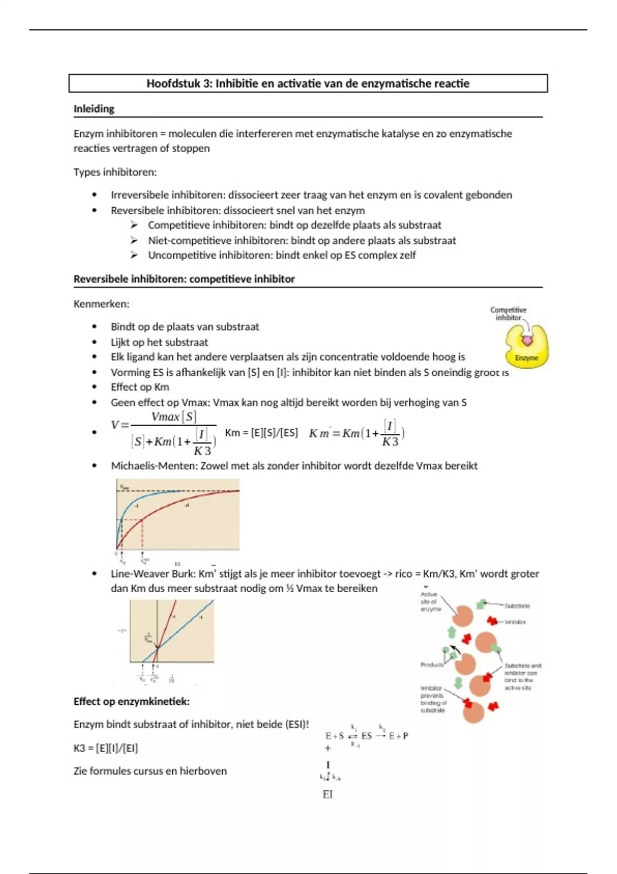 Line-Weaver Burk: Km’ stijgt als je meer inhibitor toevoegt -> rico = Km/K3, Km’ wordt groter
