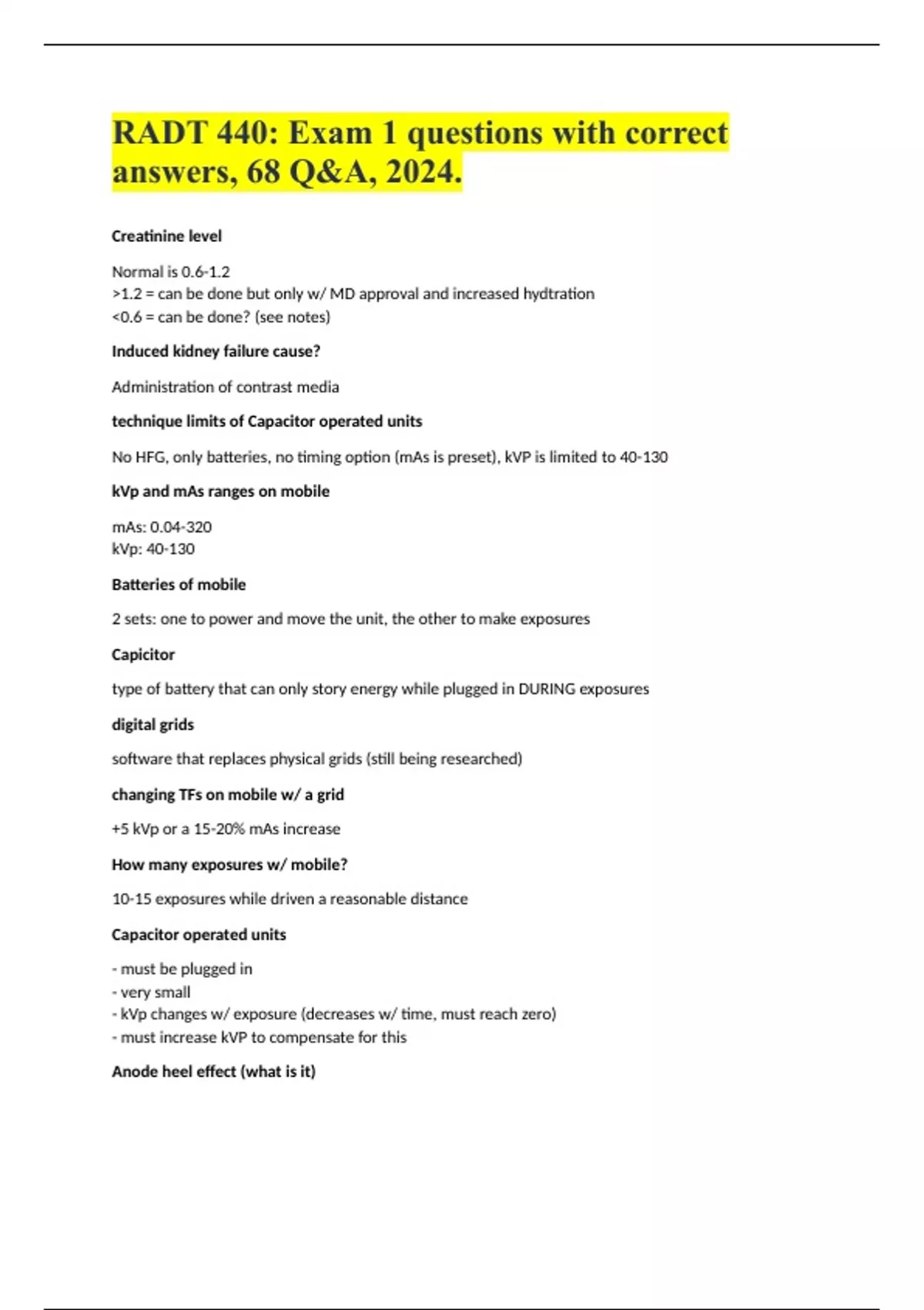 RADT 440: Exam 1 questions with correct answers, 68 Q&A, 2024. Creatinine level Normal is 0.6-1.2 >1.2 = can be done but only w/ MD approval and increased hydtration <0.6 = can be done? (see notes) Induced kidney failure cause? Administration of contrast media technique limits of Capacitor operated units No HFG, only batteries, no timing option (mAs is preset), kVP is limited to 40-130 kVp and mAs ranges on mobile mAs: 0.04-320 kVp: 40-130 Batteries of mobile 2 sets: one to power and move the unit, the other to make exposures Capicitor type of battery that can only story energy while plugged in DURING exposures digital grids software that replaces physical