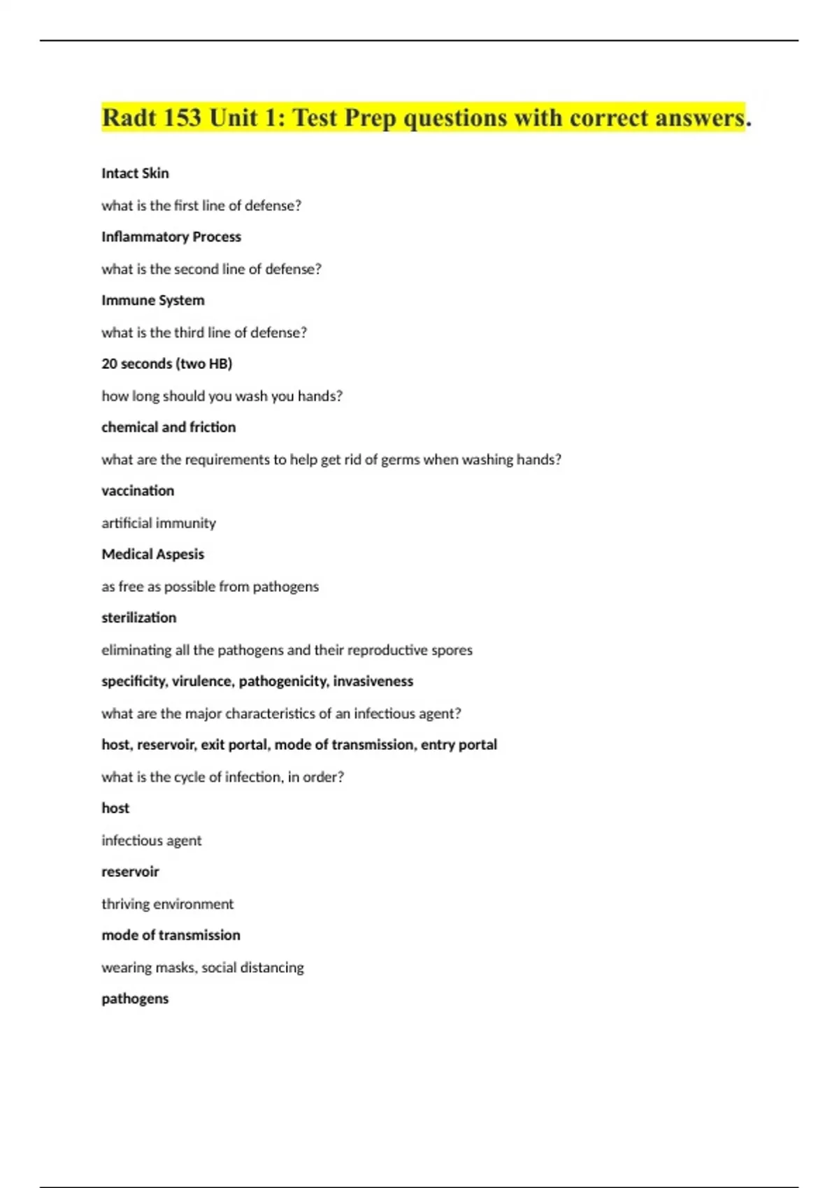 Radt 153 Unit 1: Test Prep questions with correct answers. Intact Skin what is the first line of defense? Inflammatory Process what is the second line of defense? Immune System what is the third line of defense? 20 seconds (two HB) how long should you wash you hands? chemical and friction what are the requirements to help get rid of germs when washing hands? vaccination artificial immunity