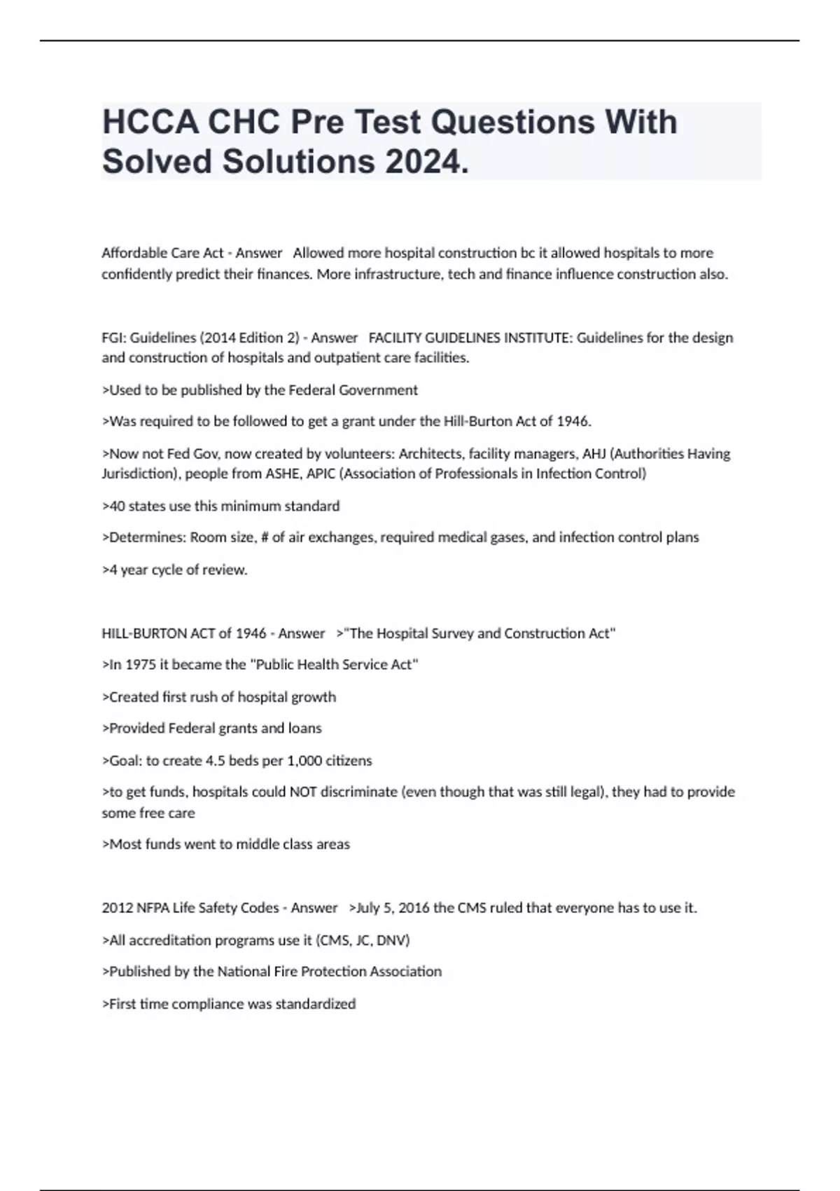 Affordable Care Act - Answer Allowed more hospital construction bc it allowed hospitals to more confidently predict their finances. More infrastructure, tech and finance influence construction also. FGI: Guidelines (2014 Edition 2) - Answer FACILITY GUIDELINES INSTITUTE: Guidelines for the design and construction of hospitals and outpatient care facilities. >Used to be published by the Federal Government >Was required to be followed to get a grant under the Hill-Burton Act of 1946. >Now not Fed Gov, now created by volunteers: Architects, facility managers, AHJ (Authorities Having Jurisdiction), people from ASHE, APIC (Association of Professionals in Infection Control) >40 states use this minimum standard >Determines: Room size, # of air exchanges, required medical gases, and infection control plans >4 year cycle of review. HILL-BURTON ACT of 1946 - Answer >"The Hospital Survey and Construction Act" >In 1975 it became the "Public Health Service Act" >Created first rush of hospital growth >Provided Federal grants and loans >Goal: to create 4.5 beds per 1,000 citizens >to get funds, hospitals could NOT discriminate (even though that was still legal), they had to provide some free care >Most funds went to middle class areas 2012 NFPA Life Safety Codes - Answer >July 5, 2016 the CMS ruled that everyone has to use it. >All accreditation programs use it (CMS, JC, DNV) >Published by the National Fire Protection Association >First time compliance was standardized