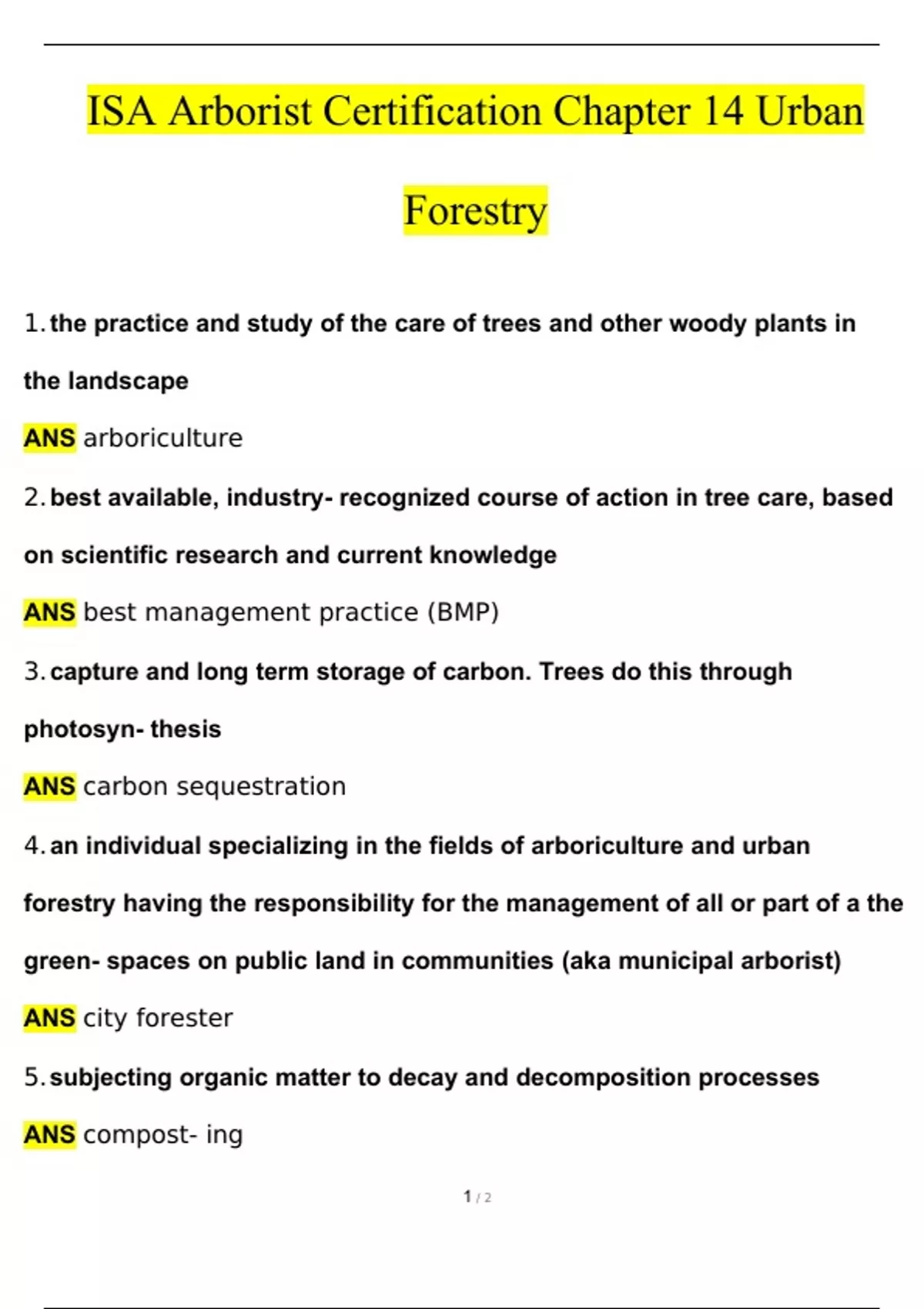 ISA Arborist Certification Chapter 14 Urban Forestry Latest 2024 Rated A+.1. the practice and study of the care of trees and other woody plants in the landscape ANS arboriculture 2. best available, industry- recognized course of action in tree care, based on scientific research and current knowledge ANS best management practice (BMP) 3. capture and long term storage of carbon. Trees do this through photosyn- thesis ANS carbon sequestration 4. an individual specializing in the fields of arboriculture and urban forestry having the responsibility for the management of all or part of a the green- spaces on public land in communities (aka municipal arborist) ANS city forester 5. subjecting organic matter to decay and decomposition processes ANS compost- ing 6. group of representatives of several tree and landscape associations that work to do research and author the Guide for Plant Appraisal ANS Council of Tree and Landscape Appraisers (CTLA) 7. complex system of living organisms and their abiotic environment ANS ecosys- tem