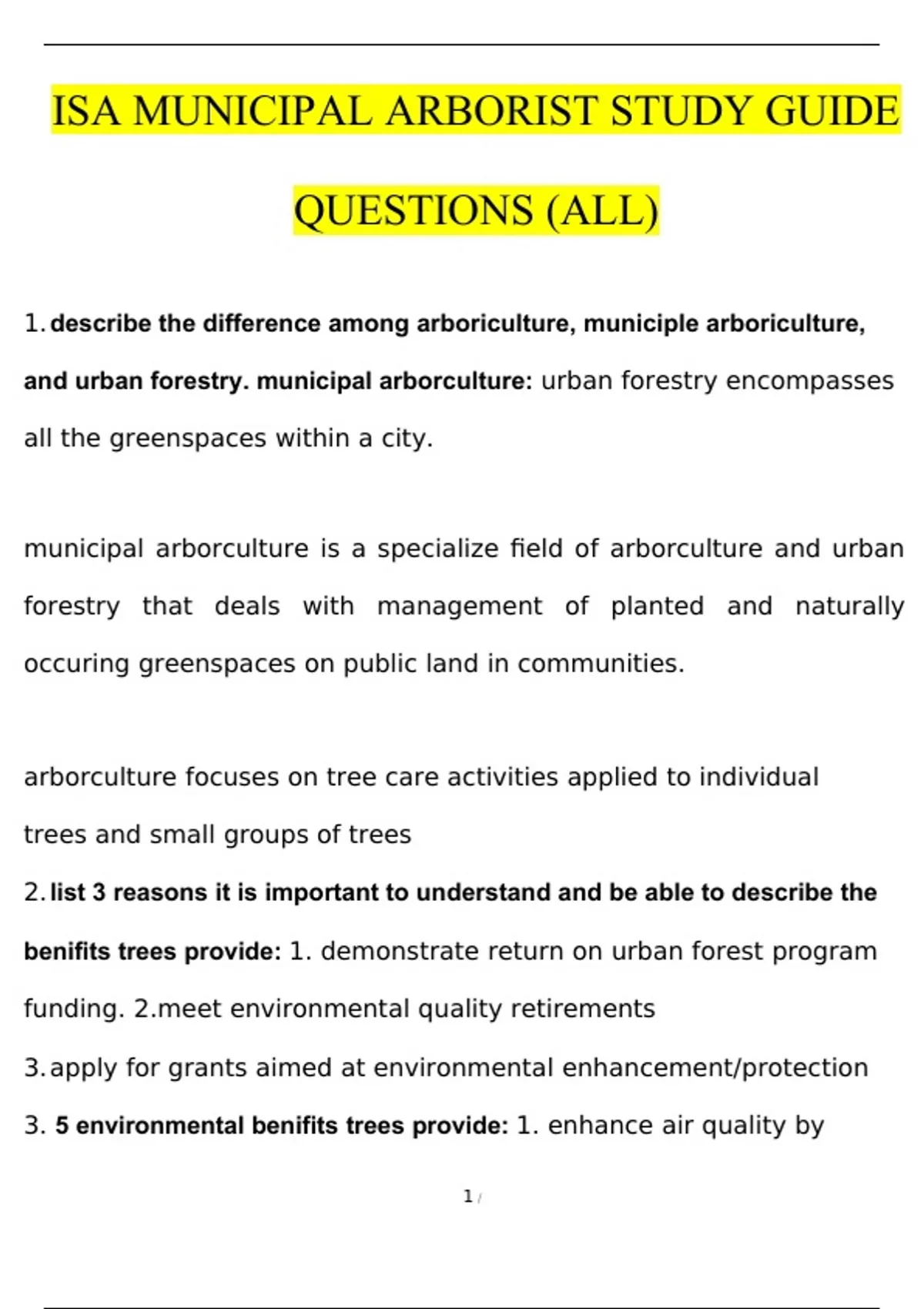 Isa Municipal Arborist Study Guide Latest 2024 Rated A+.1. describe the difference among arboriculture, municiple arboriculture, and urban forestry. municipal arborculture: urban forestry encompasses all the greenspaces within a city. municipal arborculture is a specialize field of arborculture and urban forestry that deals with management of planted and naturally occuring greenspaces on public land in communities. arborculture focuses on tree care activities applied to individual trees and small groups of trees 2. list 3 reasons it is important to understand and be able to describe the benifits trees provide: 1. demonstrate return on urban forest program funding. environmental quality retirements 3. apply for grants aimed at environmental enhancement/protection 3. 5 environmental benifits trees provide: 1. enhance air quality by absorbing and intercepting atmospheric contaminants 2. mitigate global warming through carbon sequestering 3. conserve energy through sun and wind protection 4. reduce stormwater runoff and erosion reduce smog production by lowering temperatures in cities and vehicles