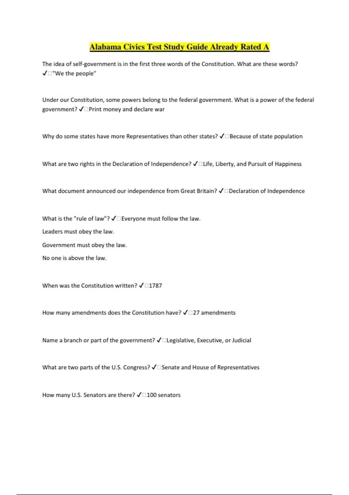 Alabama Civics Test Study Guide Already Rated A