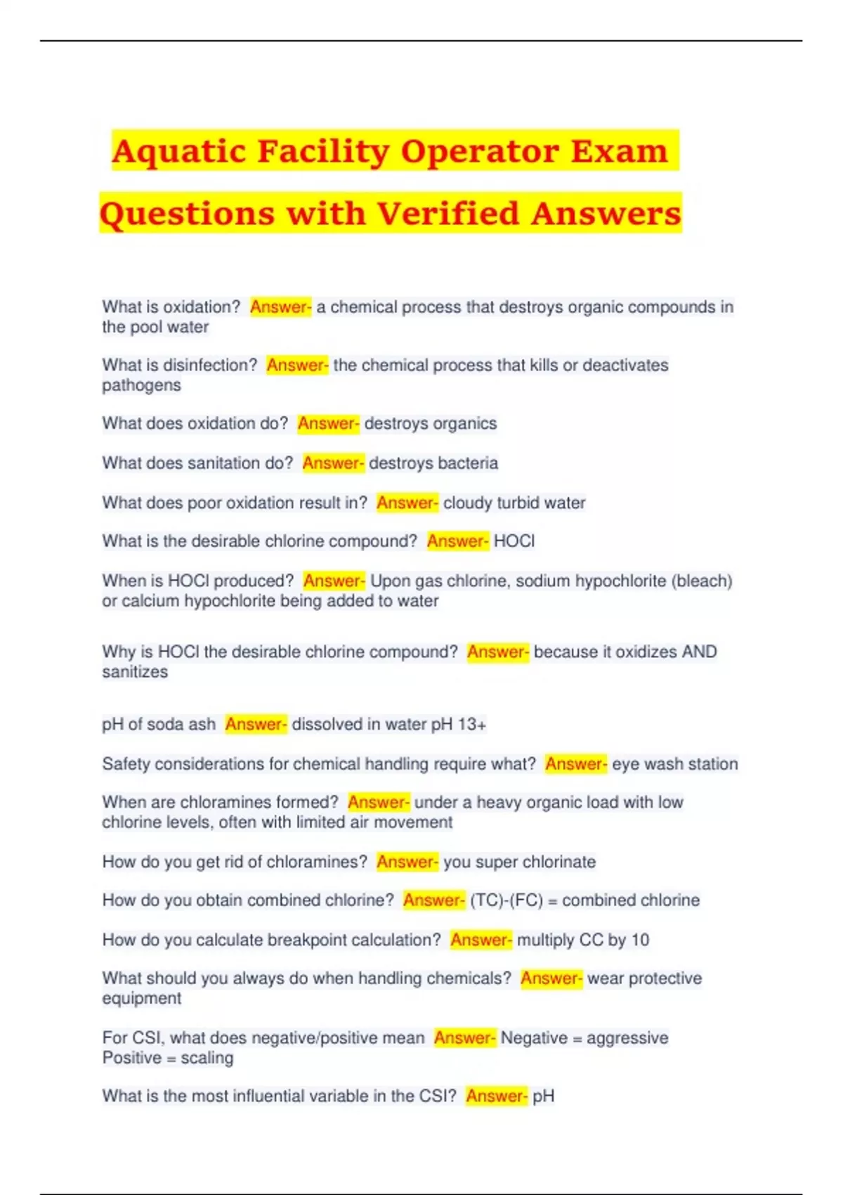 Aquatic Facility Operator Exam Questions with Verified Answers