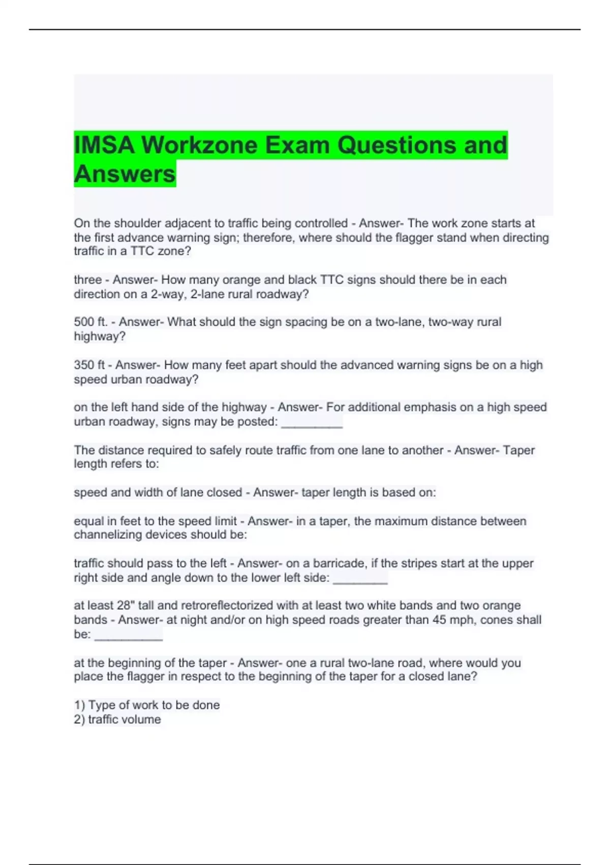IMSA Workzone Exam Questions and Answers 2024 - Graded A