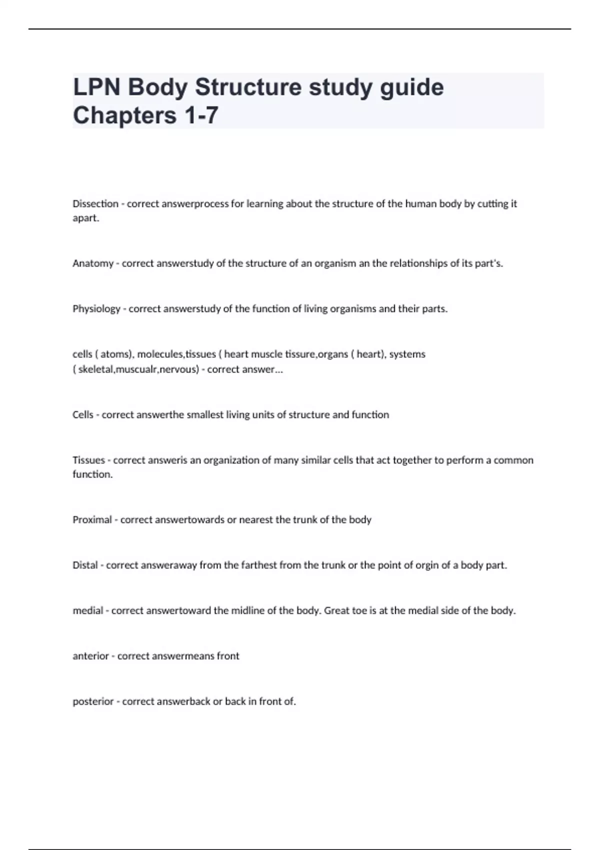 LPN Body Structure study guide Chapters 1-7 Accurate Answers 100% Verified.