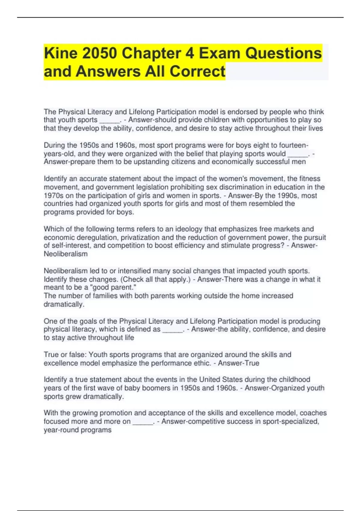 Kine 2050 Chapter 4 Exam Questions and Answers All Correct The Physical Literacy and Lifelong Participation model is endorsed by people who think that youth sports _____. - Answer-should provide children with opportunities to play so that they develop the ability, confidence, and desire to stay active throughout their lives During the 1950s and 1960s, most sport programs were for boys eight to fourteen-years-old, and they were organized with the belief that playing sports would _____. - Answer-prepare them to be upstanding citizens and economically successful men Identify an accurate statement about the impact of the women's movement, the fitness movement, and government legislation prohibiting sex discrimination in education in the 1970s on the participation of girls and women in sports. - Answer-By the 1990s, most countries had organized youth sports for girls and most of them resembled the programs provided for boys. Which of the following terms refers to an ideology that emphasizes free markets and economic deregulation, privatization and the reduction of government power, the pursuit of self-interest, and competition to boost efficiency and stimulate progress? - Answer-Neoliberalism Neoliberalism led to or intensified many social changes that impacted youth sports. Identify these changes. (Check all that apply.) - Answer-There was a change in what it meant to be a "good parent." The number of families with both parents working outside the home increased dramatically. One of the goals of the Physical Literacy and Lifelong Participation model is producing physical literacy, which is defined as _____. - Answer-the ability, confidence, and desire to stay active throughout life True or false: Youth sports programs that are organized around the skills and excellence model emphasize the performance ethic. - Answer-True Identify a true statement about the events in the United States during the childhood years of the first wave of baby boomers in 1950s and 1960s. - Answer-Organized youth sports grew dramatically.