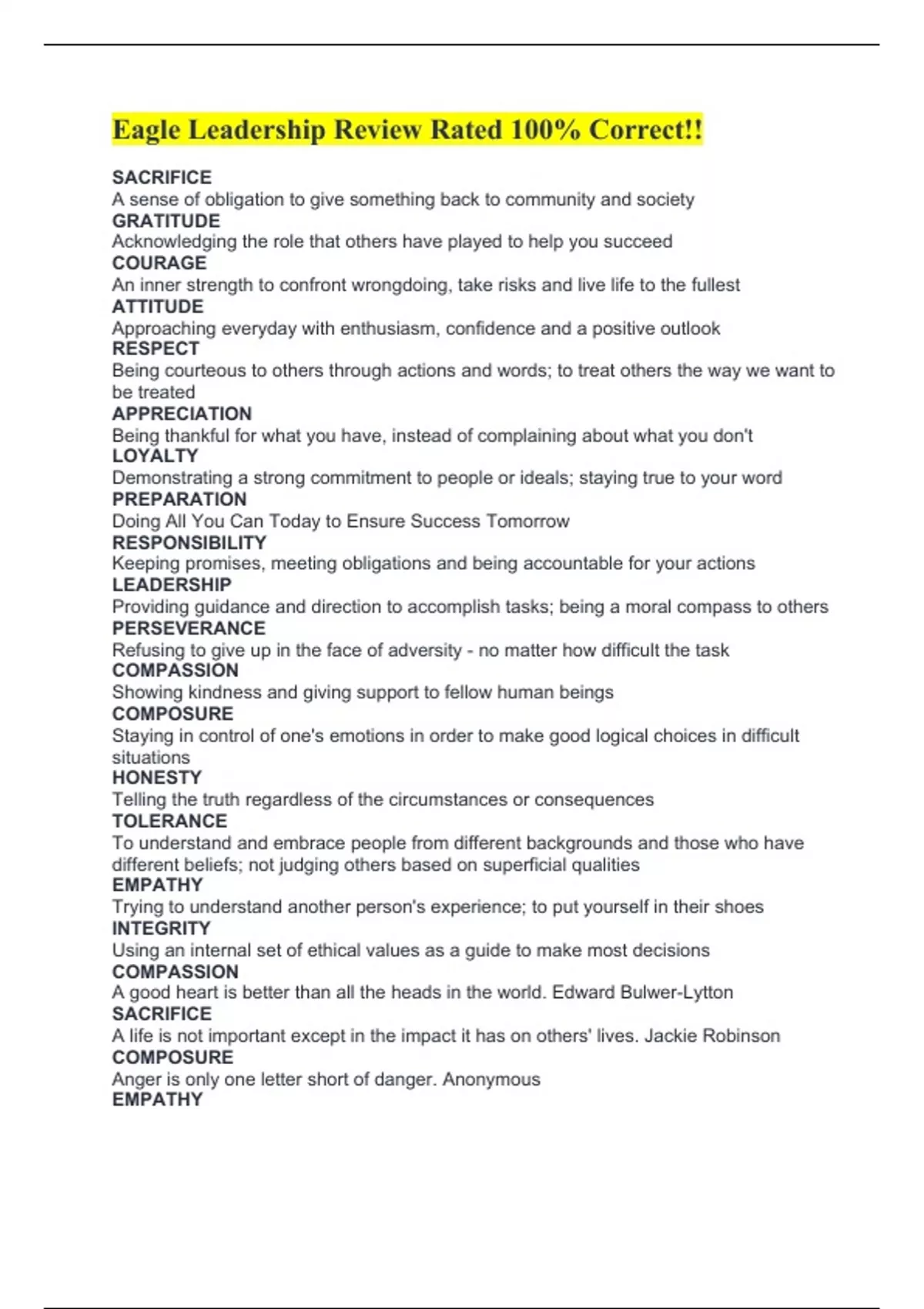 Eagle Leadership Review Rated 100% Correct!! SACRIFICE A sense of obligation to give something back to community and society GRATITUDE Acknowledging the role that others have played to help you succeed COURAGE An inner strength to confront wrongdoing, take risks and live life to the fullest ATTITUDE Approaching everyday with enthusiasm, confidence and a positive outlook RESPECT Being courteous to others through actions and words; to treat others the way we want to be treated APPRECIATION Being thankful for what you have, instead of complaining about what you don't LOYALTY Demonstrating a strong commitment to people or ideals; staying true to your word PREPARATION Doing All You Can Today to Ensure Success Tomorrow RESPONSIBILITY Keeping promises, meeting obligations and being accountable for your actions LEADERSHIP Providing guidance and direction to accomplish tasks; being a moral compass to others PERSEVERANCE Refusing to give up in the face of adversity - no matter how difficult the task COMPASSION Showing kindness and giving support to fellow human beings COMPOSURE Staying in control of one's emotions in order to make good logical choices in difficult situations HONESTY Telling the truth regardless of the circumstances or consequences TOLERANCE To understand and embrace people from different backgrounds and those who have different beliefs; not judging others based on superficial qualities EMPATHY Trying to understand another person's experience; to put yourself in their shoes INTEGRITY Using an internal set of ethical values as a guide to make most decisions COMPASSION A good heart is better than all the heads in the world. Edward Bulwer-Lytton SACRIFICE A life is not important except in the impact it has on others' lives. Jackie Robinson COMPOSURE Anger is only one letter short of danger. Anonymous EMPATHY Conversation means being able to disagree and still continue the discussion. Dwight MacDonald TOLERANCE I have a dream that my four little children will one day live in a nation where they will not be judged by the color of their skin, but by the content of their character. Martin Luther King, Jr. PERSEVERANCE I have learned that success is to be measured not so much by the position that one has reached in life as by the obstacles which he has overcome while trying to succeed. Booker T. Washington HONESTY I hope that I shall always possess firmness and virtue enough to maintain what I consider the best of all titles-the character of an honest person. George Washington APPRECIATION If I have seen further than others, it is by standing on the shoulders of giants. Sir Isaac Newton LEADERSHIP If your actions inspire others to dream more, learn more, do more, and become more, you are a leader. John Quincy Adams GRATITUDE Let us be grateful to people who make us happy; they are the charming gardeners who make our souls blossom. Marcel Proust PREPARATION Luck is what happens when preparation meets opportunity. Seneca RESPONSIBILITY People need responsibility. They resist assuming it, but they cannot get along without it. John Steinbeck RESPECT Respect your efforts, respect yourself. Self-respect leads to self-discipline. When you have both firmly under your belt, that's real power. Clint Eastwood COURAGE To be yourself in a world that is constantly trying to make you something else is the greatest accomplishment. Ralph Waldo Emerson INTEGRITY To think is easy. To act is hard. But the hardest thing in the world is to act in accordance with your thinking. Johann Wolfgang von Goethe ATTITUDE Whether you think you can, or you think you can't -- you're right. Henry Ford LOYALTY You don't earn loyalty in a day. You earn loyalty day-by-day. Jeffrey Gitomer Mattie began writing poetry just after _________________. His older brother died Mattie earned a black belt in martial arts. True Mattie never set goals because he knew that he was going to die before he could accomplish them. False "Remember to play after every storm" was one of Mattie's favorite sayings. What do you think he meant by this? Celebrate your accomplishments even when life continues to knock you down. What airline did Captain Sully fly for? US Airways Airline travel is one of the most dangerous forms of travel. False The crash landing of Flight 1549 is commonly referred to as "Miracle on the Hudson." True When Sullenberger was a young boy his father instilled hard work as an important virtue. How did he do this? His dad expanded the house room by room, year by year, doing everything himself. He then taught Sully and his sister. Captain Sully will forever be known as the pilot at the helm of Flight 1549 but it took a lifetime of preparation to successfully land the plane. List at least two ways he prepared himself for that situation. He began flying when he was 15; he was accepted into the Air Force Academy; served seven years as a fighter pilot; spent 29 years flying commercial airliners; was assigned to study plane crashes for the Air Force and the National Transportation Safety Board; was responsible for analyzing pilot error and developing new protocol for airline safety. Booker T. Washington was born a slave in this state. Virginia What did Booker T. Washington value more than anything? Education The Tuskegee Institute became famous in the 1930s and 1940s when it trained _________. Fighter pilots List at least two ways Booker T. Washington demonstrated perseverance in his life? He was determined to get an education, no matter how hard he had to work or what he had to overcome -- like slavery, his stepfather's decisions, lack of money, and race. Students at the Tuskegee Institute were required to do more than modern day students at college. List at least two of those requirements. All students were required to take part in physical labor and participate in fundraising for the college. General Eisenhower was in charge of the following military operation: D-Day in Normandy Eisenhower went to which university? West Point After t