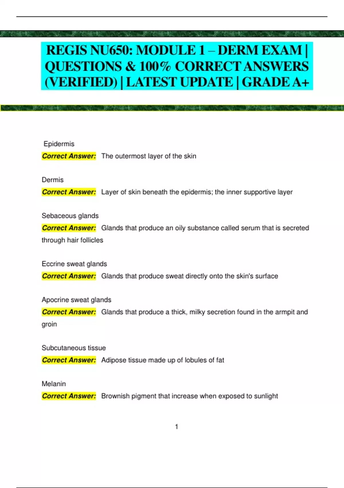REGIS NU650: MODULE 1 – DERM EXAM | QUESTIONS & 100% CORRECT ANSWERS (VERIFIED) | LATEST UPDATE | GRADEA+ Epidermis Correct Answer: The outermost layer of the skin Dermis Correct Answer: Layer of skin beneath the epidermis; the inner supportive layer Sebaceous glands Correct Answer: Glands that produce an oily substance called serum that is secreted through hair follicles Eccrine sweat glands Correct Answer: Glands that produce sweat directly onto the skin's surface Apocrine sweat glands Correct Answer: Glands that produce a thick, milky secretion found in the armpit and groin Subcutaneous tissue Correct Answer: Adipose tissue made up of lobules of fat Melanin Correct Answer: Brownish pigment that increase when exposed to sunlight 2 Carotene Correct Answer: Yellow pigmentation of the skin especially found in the palms and soles Oxyhemoglobin Correct Answer: A bright red pigment, causes redding of the skin Deoxyhemoglobin Correct Answer: Blue pigment when oxygen is released to the tissues