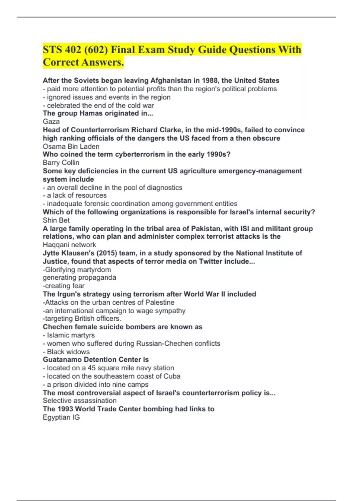 STS 402 (602) Final Exam Study Guide Questions With Correct Answers. After the Soviets began leaving Afghanistan in 1988, the United States - paid more attention to potential profits than the region's political problems - ignored issues and events in the region - celebrated the end of the cold war The group Hamas originated in... Gaza Head of Counterterrorism Richard Clarke, in the mid-1990s, failed to convince high ranking officials of the dangers the US faced from a then obscure Osama Bin Laden Who coined the term cyberterrorism in the early 1990s? Barry Collin Some key deficiencies in the current US agriculture emergency-management system include - an overall decline in the pool of diagnostics - a lack of resources - inadequate forensic coordination among government entities Which of the following organizations is responsible for Israel's internal security? Shin Bet A large family operating in the tribal area of Pakistan, with ISI and militant group relations, who can plan and administer complex terrorist attacks is the Haqqani network Jytte Klausen's (2015) team, in a study sponsored by the National Institute of Justice, found that aspects of terror media on Twitter include... -Glorifying martyrdom generating propaganda -creating fear The Irgun's strategy using terrorism after World War II included -Attacks on the urban centres of Palestine -an international campaign to wage sympathy -targeting British officers. Chechen female suicide bombers are known as - Islamic martyrs - women who suffered during Russian-Chechen conflicts - Black widows Guatanamo Detention Center is - located on a 45 square mile navy station - located on the southeastern coast of Cuba - a prison divided into nine camps The most controversial aspect of Israel's counterterrorism policy is... Selective assassination The 1993 World Trade Center bombing had links to Egyptian IG On November 5, 2009, U.S. Army Major Nidal Milk Hasan went on a shooting spree killing thirteen people in Fort Hood, TX The phrase "the poor man's nuclear weapon," although misleading, is often used to refer to a dirty bomb Qassam rockets, famous for their inaccuracy, are made in Gaza The first secular Palestinian group to use suicide terrorism was the Al Aqsa Martyrs Brigades A raid by Indian troops in 1984 on theGoldeTemple (Temple of God), the sacred shrine of Sikhism in Amristar (in response to a Sik faction seeking independence) led to - Sikhs forming terrorist cells - targeting of Indian Security forces - the assassination of India's Prime Minister Terrorists behave differently from ordinary criminals in that criminals rarely train A deadly suicide mission by jihadists that took place in September 2004, resulting in 330 deaths that included 156 children, occurred in North Ossetia According to Marc Sageman, what is the first step of radicalization? Alienation According to Global Witness, in West Africa al Qaeda spent 10 years moving into unregulated Diamond trading Mullah Abdul Salam Zaeef - was a detainee of Guatanamo until 2005 - Considers himself a founder of the Taliban - was Taliban ambassador to Pakistan before the U.S. invasion The term terrorism, first used by British philosopher Edmund Burke, appeared During a violent period in revolutionary France from The United States courted Franco's fascist government after World War II, in spite of Franco's support for Hitler, because of wanting American air bases in Spain A dirty bomb consists of ordinary explosives mixed with radioactive material Ariel Sharon's visit to the Temple Mount with armed escorts, in September of 2000, sparked what uprising? Al Aqsa Intifada What group grew out of the Iranian Revolution, acting as a terrorist clearinghouse during its first years, to later to become one of the strongest nonstate groups in the Middle East Hezbollah Operation Cast Lead refers to An air and artillary assault on Gaza followed by a ground invasion in 2008