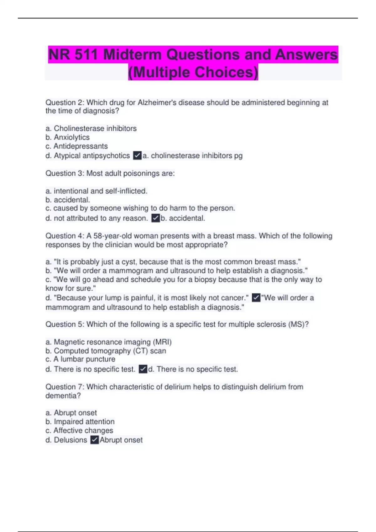 Question 2: Which drug for Alzheimer's disease should be administered beginning at the time of diagnosis? a. Cholinesterase inhibitors b. Anxiolytics c. Antidepressants d. Atypical antipsychotics a. cholinesterase inhibitors pg Question 3: Most adult poisonings are: a. intentional and self-inflicted. b. accidental. c. caused by someone wishing to do harm to the person. d. not attributed to any reason. b. accidental. Question 4: A 58-year-old woman presents with a breast mass. Which of the following responses by the clinician would be most appropriate? a. "It is probably just a cyst, because that is the most common breast mass." b. "We will order a mammogram and ultrasound to help establish a diagnosis." c. "We will go ahead and schedule you for a biopsy because that is the only way to know for sure." d. "Because your lump is painful, it is most likely not cancer." "We will order a mammogram and ultrasound to help establish a diagnosis." Question 5: Which of the following is a specific test for multiple sclerosis (MS)? a. Magnetic resonance imaging (MRI) b. Computed tomography (CT) scan c. A lumbar puncture d. There is no specific test. d. There is no specific test. Question 7: Which characteristic of delirium helps to distinguish delirium from dementia? a. Abrupt onset b. Impaired attention c. Affective changes d. Delusions Abrupt onset