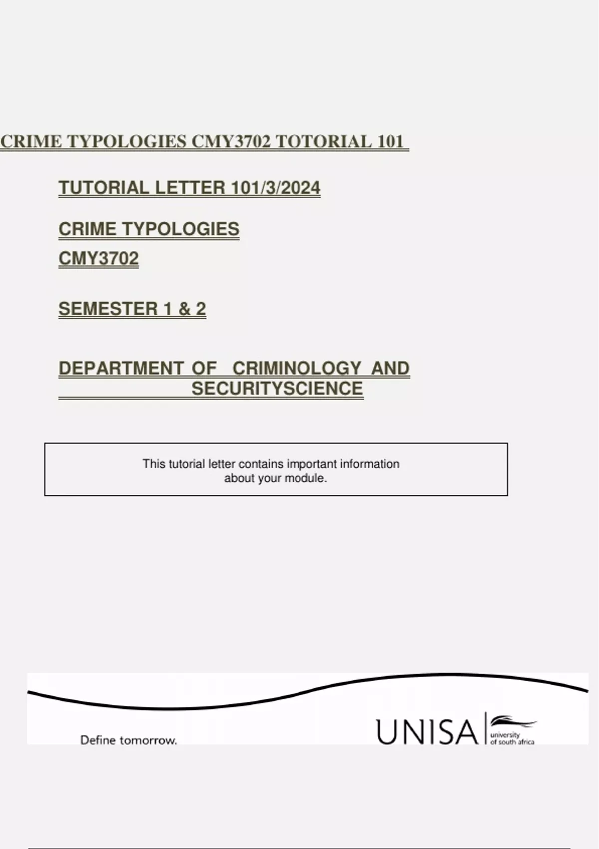 CRIME TYPOLOGIES CMY3702 TOTORIAL 101 TUTORIAL LETTER 101/3/2024 CRIME TYPOLOGIES