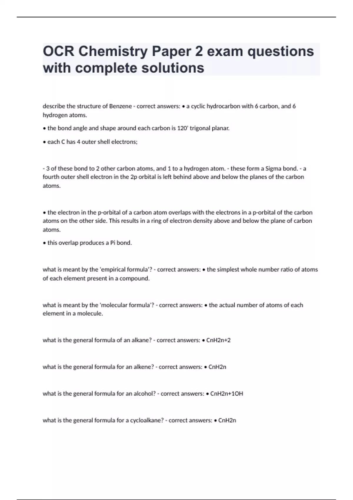 describe the structure of Benzene - correct answers: • a cyclic hydrocarbon with 6 carbon, and 6 hydrogen atoms. • the bond angle and shape around each carbon is 120' trigonal planar. • each C has 4 outer shell electrons; - 3 of these bond to 2 other carbon atoms, and 1 to a hydrogen atom. - these form a Sigma bond. - a fourth outer shell electron in the 2p orbital is left behind above and below the planes of the carbon atoms. • the electron in the p-orbital of a carbon atom overlaps with the electrons in a p-orbital of the carbon atoms on the other side. This results in a ring of electron density above and below the plane of carbon atoms. • this overlap produces a Pi bond. what is meant by the 'empirical formula'? - correct answers: • the simplest whole number ratio of atoms of each element present in a compound. what is meant by the 'molecular formula'? - correct answers: • the actual number of atoms of each element in a molecule.