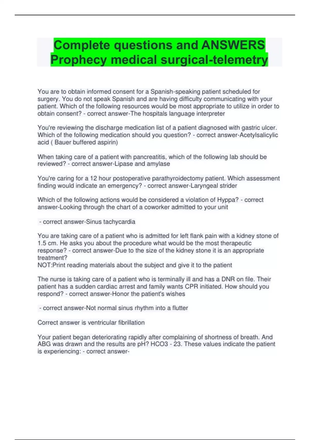 You are to obtain informed consent for a Spanish-speaking patient scheduled for surgery. You do not speak Spanish and are having difficulty communicating with your patient. Which of the following resources would be most appropriate to utilize in order to obtain consent? - correct answer-The hospitals language interpreter You're reviewing the discharge medication list of a patient diagnosed with gastric ulcer. Which of the following medication should you question? - correct answer-Acetylsalicylic acid ( Bauer buffered aspirin) When taking care of a patient with pancreatitis, which of the following lab should be reviewed? - correct answer-Lipase and amylase You're caring for a 12 hour postoperative parathyroidectomy patient. Which assessment finding would indicate an emergency? - correct answer-Laryngeal strider Which of the following actions would be considered a violation of Hyppa? - correct answer-Looking through the chart of a coworker admitted to your unit - correct answer-Sinus tachycardia You are taking care of a patient who is admitted for left flank pain with a kidney stone of 1.5 cm. He asks you about the procedure what would be the most therapeutic response? - correct answer-Due to the size of the kidney stone it is an appropriate treatment? NOT:Print reading materials about the subject and give it to the patient The nurse is taking care of a patient who is terminally ill and has a DNR on file. Their patient has a sudden cardiac arrest and family wants CPR initiated. How should you respond? - correct answer-Honor the patient's wishes - correct answer-Not normal sinus rhythm into a flutter Correct answer is ventricular fibrillation Your patient began deteriorating rapidly after complaining of shortness of breath. And ABG was drawn and the results are pH? HCO3 - 23. These values indicate the patient is experiencing: - correct answer