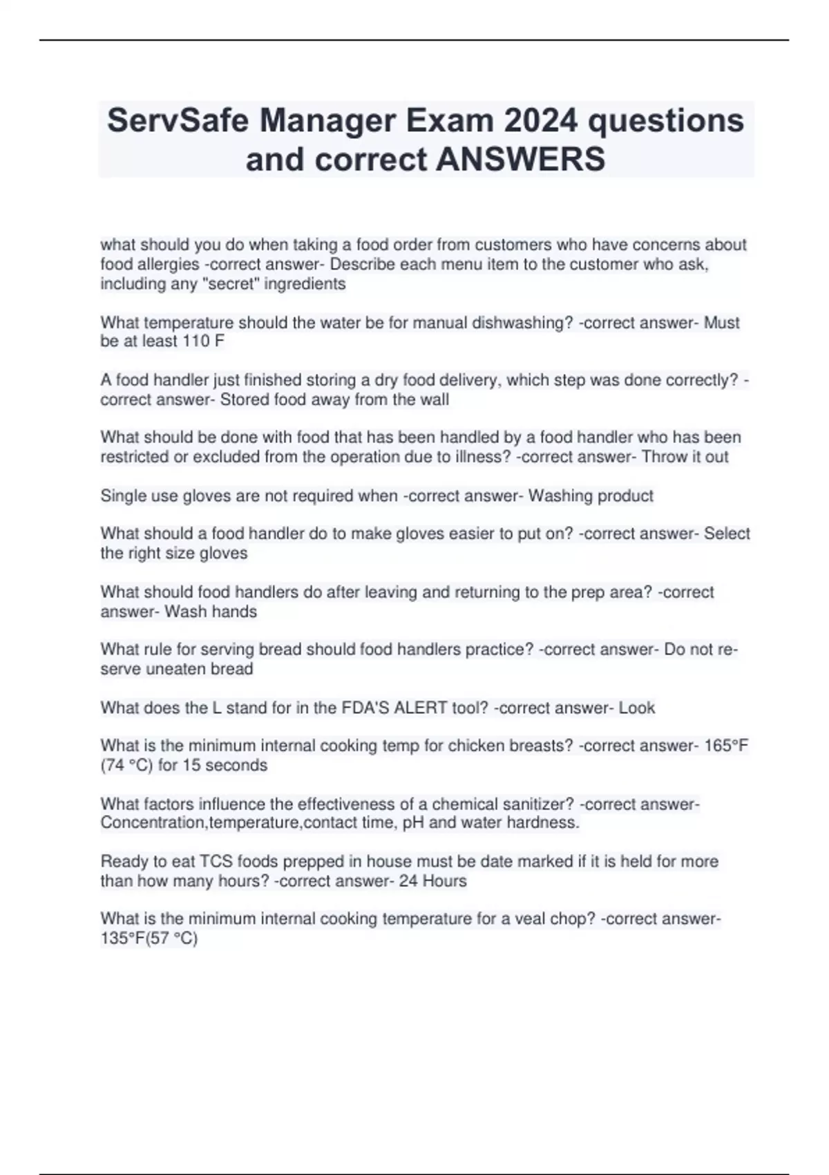 what should you do when taking a food order from customers who have concerns about food allergies -correct answer- Describe each menu item to the customer who ask, including any "secret" ingredients What temperature should the water be for manual dishwashing? -correct answer- Must be at least 110 F A food handler just finished storing a dry food delivery, which step was done correctly? -correct answer- Stored food away from the wall What should be done with food that has been handled by a food handler who has been restricted or excluded from the operation due to illness? -correct answer- Throw it out Single use gloves are not required when -correct answer- Washing product What should a food handler do to make gloves easier to put on? -correct answer- Select the right size gloves What should food handlers do after leaving and returning to the prep area? -correct answer- Wash hands What rule for serving bread should food handlers practice? -correct answer- Do not re-serve uneaten bread What does the L stand for in the FDA'S ALERT tool? -correct answer- Look What is the minimum internal cooking temp for chicken breasts? -correct answer- 165°F (74 °C) for 15 seconds What factors influence the effectiveness of a chemical sanitizer? -correct answer- Concentration,temperature,contact time, pH and water hardness. Ready to eat TCS foods prepped in house must be date marked if it is held for more than how many hours? -correct answer- 24 Hours What is the minimum internal cooking temperature for a veal chop? -correct answer- 135°F(57 °C)