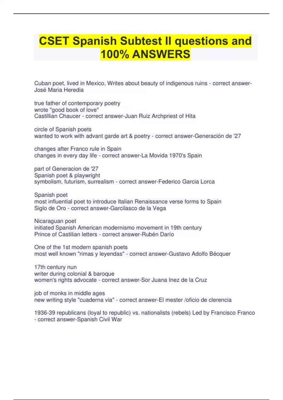 Cuban poet, lived in Mexico, Writes about beauty of indigenous ruins - correct answer-José Maria Heredia true father of contemporary poetry wrote "good book of love" Castillian Chaucer - correct answer-Juan Ruiz Archpriest of Hita circle of Spanish poets wanted to work with advant garde art & poetry - correct answer-Generación de '27 changes after Franco rule in Spain changes in every day life - correct answer-La Movida 1970's Spain part of Generacion de '27 Spanish poet & playwright symbolism, futurism, surrealism - correct answer-Federico Garcia Lorca Spanish poet most influential poet to introduce Italian Renaissance verse forms to Spain Siglo de Oro - correct answer-Garcilasco de la Vega Nicaraguan poet initiated Spanish American modernismo movement in 19th century Prince of Castilian letters - correct answer-Rubén Darío One of the 1st modern spanish poets most well known "rimas y leyendas" - correct answer-Gustavo Adolfo Bécquer 17th century nun writer during colonial & baroque women's rights advocate - correct answer-Sor Juana Inez de la Cruz job of monks in middle ages new writing style "cuaderna via" - correct answer-El mester /oficio de clerencia 1936-39 republicans (loyal to republic) vs. nationalists (rebels) Led by Francisco Franco - correct answer