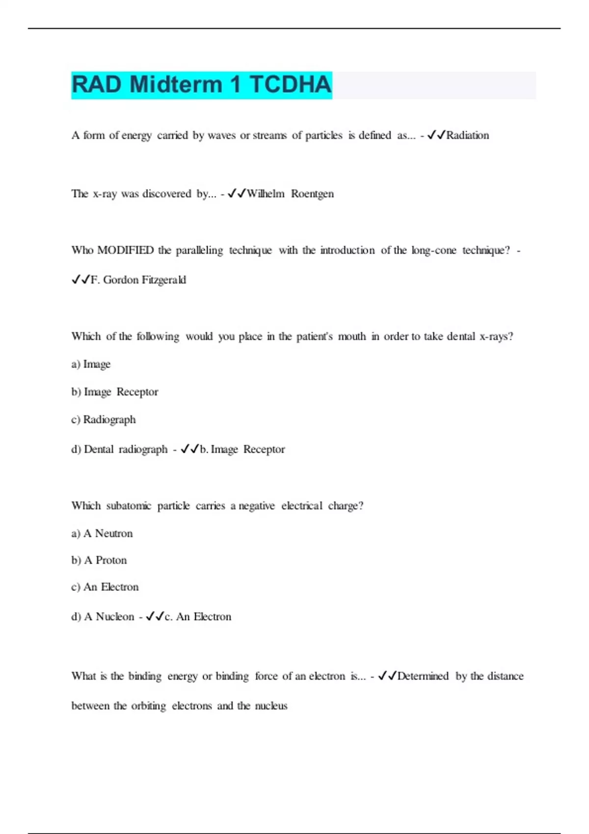 RAD Midterm 1 TCDHA A form of energy carried by waves or streams of particles is defined as... - Radiation The x-ray was discovered by... - Wilhelm Roentgen Who MODIFIED the paralleling technique with the introduction of the long-cone technique? - F. Gordon Fitzgerald Which of the following would you place in the patient's mouth in order to take dental x-rays? a) Image b) Image Receptor c) Radiograph d) Dental radiograph - b. Image Receptor Which subatomic particle carries a negative electrical charge? a) A Neutron b) A Proton c) An Electron d) A Nucleon - c. An Electron What is the binding energy or binding force of an electron is... - Determined by the distance between the orbiting electrons and the nucleus A spontaneous emission of radiation from the disintegration of unstable atomic nuclei is... - Radioactivity Cathode rays are derived from which of the following types of particulate radiation? a. Electrons b. Alpha Particles c. Protons d. alpha particle decay - a. Electrons What type of radiation includes x-rays and visible light? - Electromagnetic Approximately what percentage of the kinetic energy of the electrons is converted to x-rays at the anode? - Less than 1% What restricts the size of the x-ray beam? - The Lead Collimator Which form of the x-ray beam is more detrimental to the patient and operator? - Scatter Radiation What happens with the electrons when the kilovoltage is increased? - The electrons moves from the CATHODE to the ANODE with more speed Higher-energy x-ray beam with increased penetrating ability results by... - When the kilovolt is increased (1) Density is the overall darkness or blackness of a dental image. (2) When the kilovoltage is increased while other exposure factors remain constant, the resultant image exhibits a decreased density and appears lighter. a. Both statement are true b. Both statement are false c. The first statement is true; the second statement is false - c. The first statement is true; the second statement is false What controls the quantity of x-rays produced? - Milliamperage (mA) In regard to increasing density: - An increase in either kVp or mA will increase density. According to inverse square law, the intensity of radiation is ________ proportional to the _________ from the source of radiation. - Inversely; square of the distance Aluminium filters are used to remove ________ -energy, _________ wavelength x-rays. - Low; Longer What specific mechanism of radiation injury may result in the formation of hydrogen peroxide when x-ray energy is absorbed by patients? - Free radical formation created by the ionization of water may occur. What is associated with long-term radiation effects? - Small amounts of radiation absorbed over a long period.