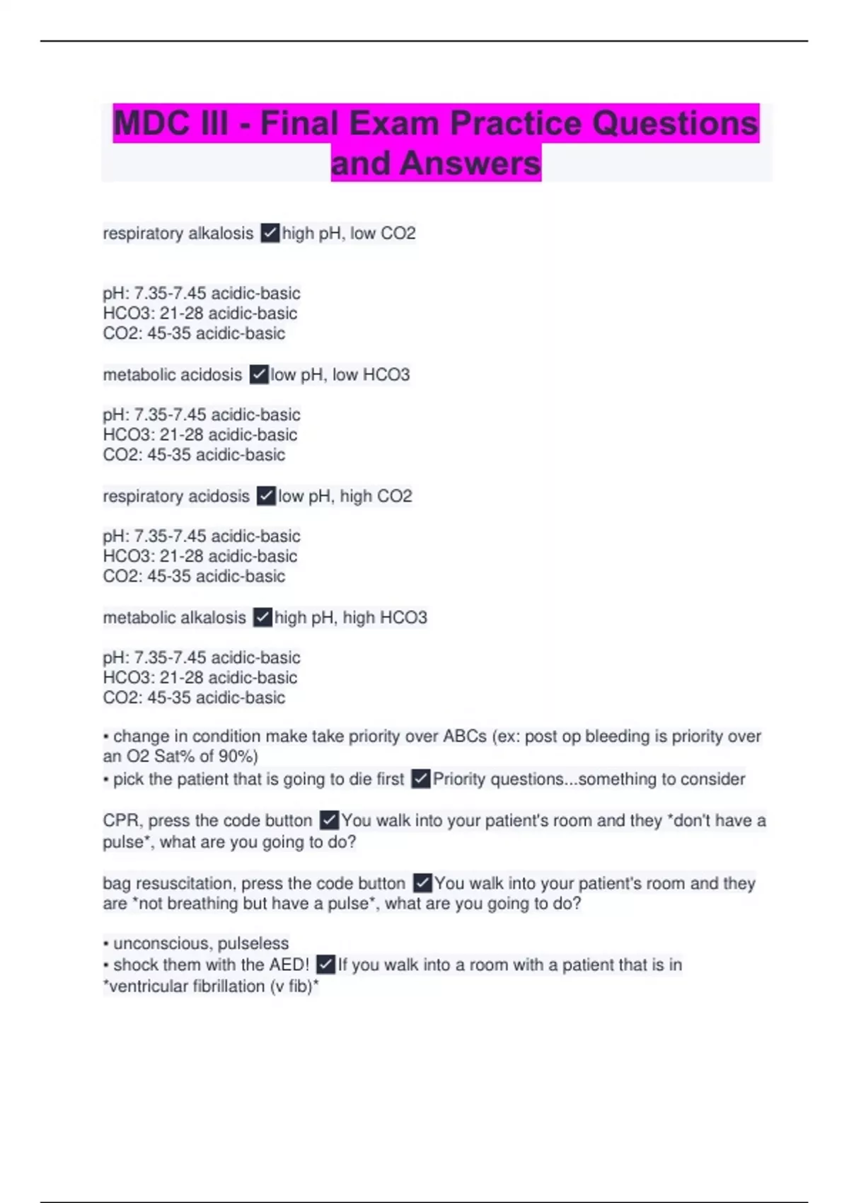respiratory alkalosis high pH, low CO2 pH: 7.35-7.45 acidic-basic HCO3: 21-28 acidic-basic CO2: 45-35 acidic-basic metabolic acidosis low pH, low HCO3 pH: 7.35-7.45 acidic-basic HCO3: 21-28 acidic-basic CO2: 45-35 acidic-basic respiratory acidosis low pH, high CO2 pH: 7.35-7.45 acidic-basic HCO3: 21-28 acidic-basic CO2: 45-35 acidic-basic metabolic alkalosis high pH, high HCO3 pH: 7.35-7.45 acidic-basic HCO3: 21-28 acidic-basic CO2: 45-35 acidic-basic ▪ change in condition make take priority over ABCs (ex: post op bleeding is priority over an O2 Sat% of 90%) ▪ pick the patient that is going to die first Priority questions...something to consider CPR, press the code button You walk into your patient's room and they *don't have a pulse*, what are you going to do? bag resuscitation, press the code button You walk into your patient's room and they are *not breathing but have a pulse*, what are you going to do? ▪ unconscious, pulseless ▪ shock them with the AED! If you walk into a room with a patient that is in *ventricular fibrillation (v fib)* ▪ How will they present? ▪ What must we do to get them out of that state?