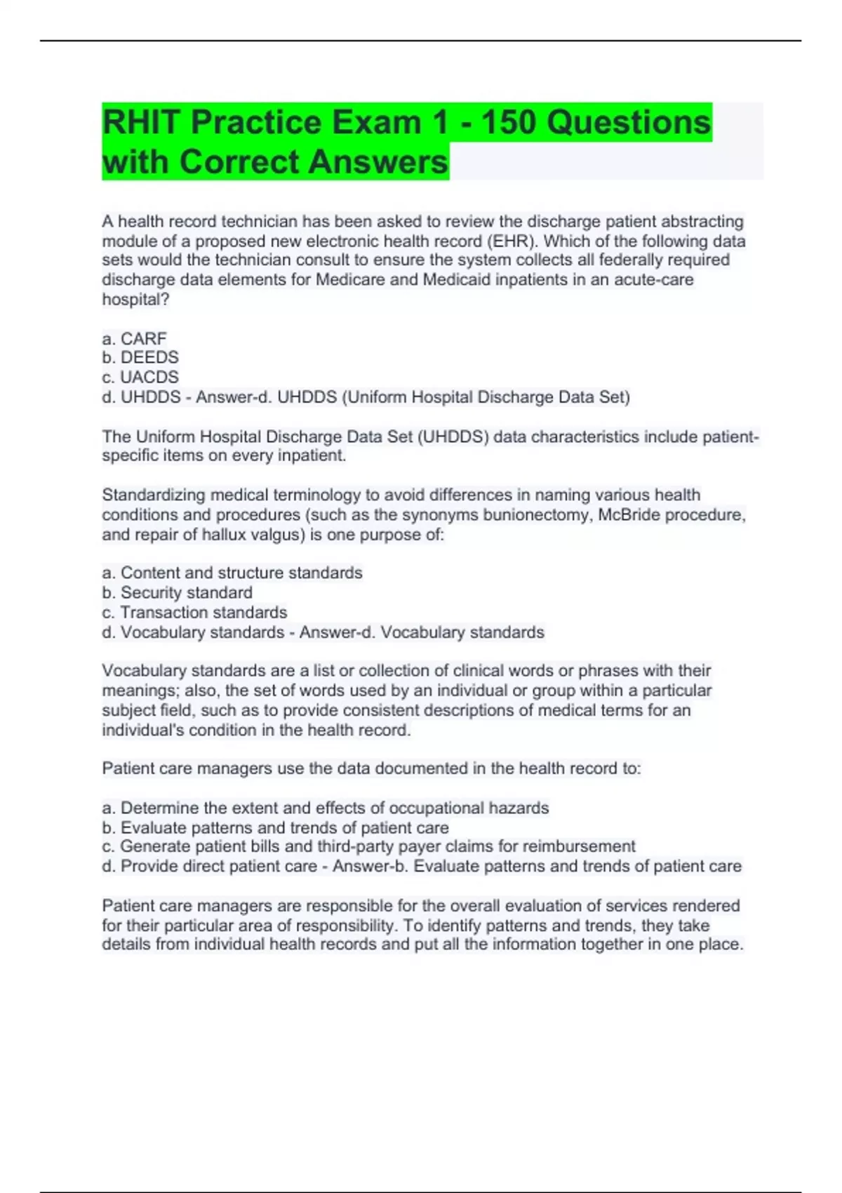 RHIT Practice Exam 1 - 150 Questions with Correct Answers authority over the on-call physicians for suggestions on how to improve response to the current notices A coding manager or physician champion should present documentation issues to educate the medical staff. General areas of concern regarding documentation should be included. Valley High, a skilled nursing facility, wants to become certified to take part in federal government reimbursement programs such as Medicare and Medicaid. What standards must the facility meet to become certified for these programs? a. Minimum Data Set b. National Commission on Correctional Health Care c. Conditions of Participation d. Outcomes and Assessment Information Set - Answer-c. Conditions of Participation Administered by the federal government Centers for Medicare and Medicaid Services (CMS), the Medicare Conditions of Participation or Conditions for Coverage apply to a variety of healthcare organizations that participate in the Medicare program. In other words, participating organizations receive federal funds from the Medicare program for services provided to patients and, thus, must follow the Medicare Conditions of Participation. A health record with deficiencies that is not completed within the timeframe specified in the medical staff rules and regulations is called a(n): a. Suspended record b. Delinquent record c. Pending record d. Illegal record - Answer-b. Delinquent record When an incomplete record is not rectified within a specific number of days as indicated in the medical staff rules and regulations, the record is considered to be a delinquent record. The HIM department monitors the delinquent record rate very closely to ensure compliance with accrediting standards. How do accreditation organizations such as the Joint Commission use the health record? a. To serve as a source for case study information b. To determine whether the documentation supports the provider's claim for reimbursement c. To provide healthcare services d. To determine whether standards of care are being met - Answer-d. To determine whether standards of care are being met