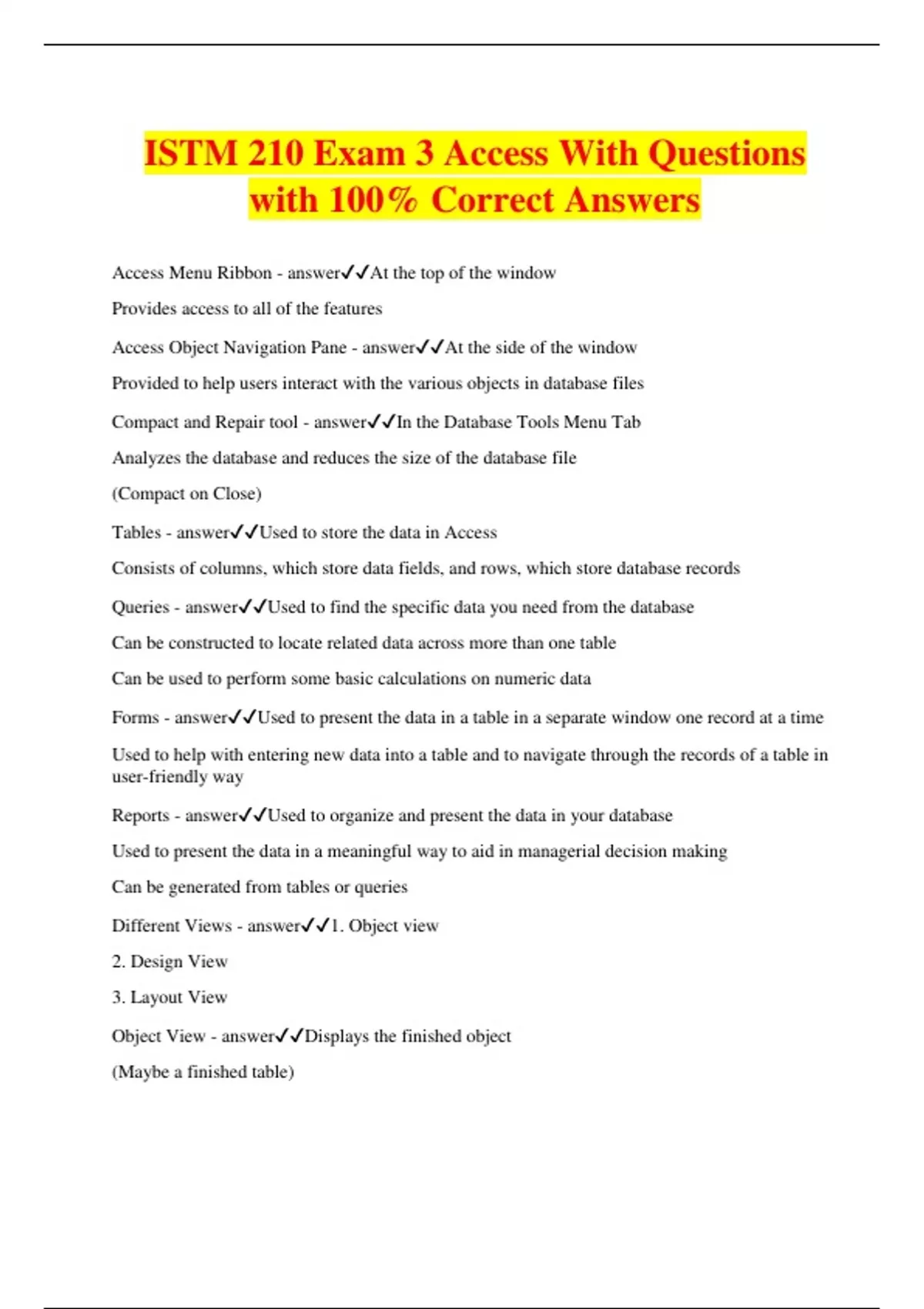 ISTM 210 Exam 3 Access With Questions with 100% Correct Answers Access Menu Ribbon - answerAt the top of the window Provides access to all of the features Access Object Navigation Pane - answerAt the side of the window Provided to help users interact with the various objects in database files Compact and Repair tool - answerIn the Database Tools Menu Tab Analyzes the database and reduces the size of the database file (Compact on Close) Tables - answerUsed to store the data in Access Consists of columns, which store data fields, and rows, which store database records Queries - answerUsed to find the specific data you need from the database Can be constructed to locate related data across more than one table Can be used to perform some basic calculations on numeric data Forms - answerUsed to present the data in a table in a separate window one record at a time Used to help with entering new data into a table and to navigate through the records of a table in user-friendly way Reports - answerUsed to organize and present the data in your database Used to present the data in a meaningful way to aid in managerial decision making Can be generated from tables or queries Different Views - answer1. Object view 2. Design View 3. Layout View Object View - answerDisplays the finished object (Maybe a finished table) Design View - answerUsed to edit the object Allows you to add and configure the field in a table Allows you to add elements to the form or report and change the appearance of those elements Layout View - answerLike the design view, but provides fewer options for manipulating the object Often easier to use than the design view Not always an option to use Relation - answerTechnical term for a table Is the basis of the term "Relational Database" Relationship - answerWhen a table contains data associated with data from another table within the database Entity - answerSomething you are collecting data on Attribute - answerData stored for each database record Record - answerRow in the table All the information you have about specific instances of an entity Field - answerColumn in the table All information you have of an attribute Prometheus approach to creating tables - answerTable Design Naming fields - answer1. Should be meaningful and descriptive 2. Allows you to use spaces, but not recommended 3. Use only letters and numbers, no symbols or special letters Data types for fields - answer1. Short Text (up to 255 characters) 2. Long Text (up to 65,536 characters) 3. Number (positive or negative) 4. Date/Time 5. Currency (number data type starting with $) 6. AutoNumber (Access automatically generates a number when a new record is added to the table) 7. Yes/No 8. OLE Object (stores files, recommended to use attachment instead) 9. Hyperlink (links to websites or folders/files on computer) 10. Attachment (stores files for a database record, could be virtually any format) 11. Calculated (creates a field generated by a formula, often refers to values in other fields) 12. Lookup Wizard (simplifies data entry, presents the user with a list of items to choose from when entering new record) Field properties - answer1. Field size (how large the field will be, how many characters, numbers, and precision) 2. Input Mask (sets rules for how the data will be entered in the field) 3. Default value (have an automatic starting value for the field when a new record is added) 4. Validation rule/validation text (checks values to make sure they fit a specific rule) 5. Required (makes sure that a value is entered for a field when a new record is added to a table) Primary Key - answeruniquely identifies each record in a table Often is the first field of the table Indicated by a small gold key to the left of the field Foreign Key - answerWhen a field is used to link two tables Normalization - answerThe process of organizing tables and relationships between tables 1. We want each table to contain data about very specific things 2. We want to limit duplicated or redundant information as much as possible Types of relationships between tables in a database - answer1. One to One (1:1) 2. One to Many (1:M) 3. Many to Many (M:M) One to One relationship - answerRepresents a situation where a record from one table can only be associated with one record from the other table One to Many relationship - answerMost common type of relationship Means that a single record from one table could be associated with more than one record from the second table, but a record from the second table can only be associated with one record from the first table