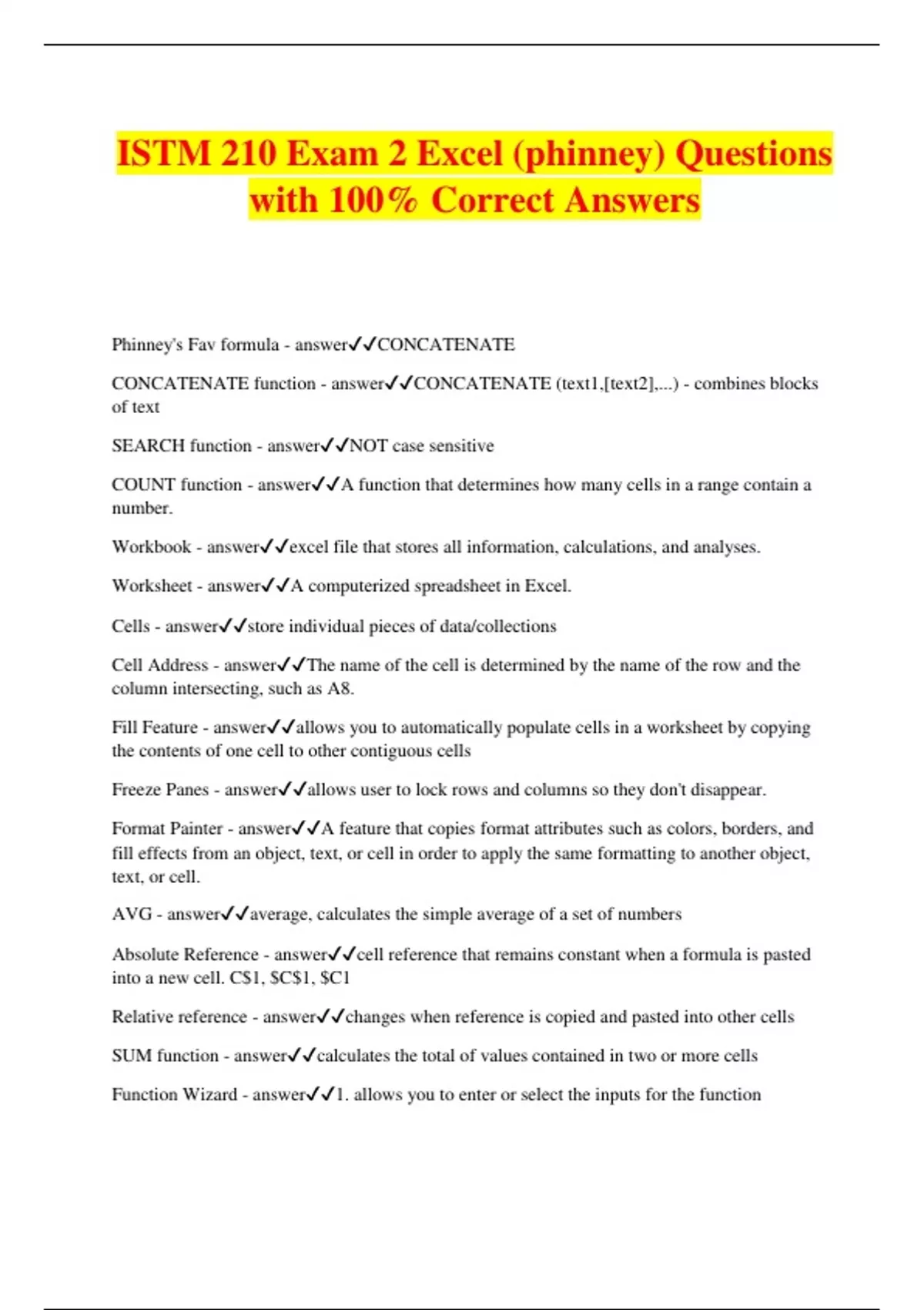 ISTM 210 Exam 2 Excel (phinney) Questions with 100% Correct Answers Phinney's Fav formula - answerCONCATENATE CONCATENATE function - answerCONCATENATE (text1,[text2],...) - combines blocks of text SEARCH function - answerNOT case sensitive COUNT function - answerA function that determines how many cells in a range contain a number. Workbook - answerexcel file that stores all information, calculations, and analyses. Worksheet - answerA computerized spreadsheet in Excel. Cells - answerstore individual pieces of data/collections Cell Address - answerThe name of the cell is determined by the name of the row and the column intersecting, such as A8. Fill Feature - answerallows you to automatically populate cells in a worksheet by copying the contents of one cell to other contiguous cells Freeze Panes - answerallows user to lock rows and columns so they don't disappear. Format Painter - answerA feature that copies format attributes such as colors, borders, and fill effects from an object, text, or cell in order to apply the same formatting to another object, text, or cell. AVG - answeraverage, calculates the simple average of a set of numbers Absolute Reference - answercell reference that remains constant when a formula is pasted into a new cell. C$1, $C$1, $C1 Relative reference - answerchanges when reference is copied and pasted into other cells SUM function - answercalculates the total of values contained in two or more cells Function Wizard - answer1. allows you to enter or select the inputs for the function 2. provides a description of the function and each argument 3. lists the function result based on the inputs you enter COUNT - answercounts the number of cells in a range of cells that contain numbers MAX - answerreturns the largest v