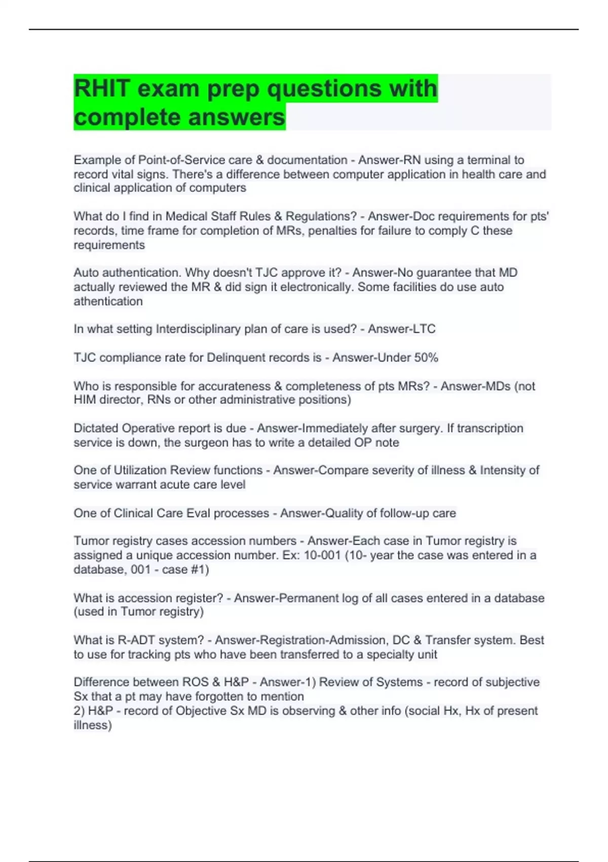 RHIT exam prep questions with complete answers CARF - Answer-Commission on Accreditation of Rehab Facilities Pt certification period in Home Health - Answer-60 days. Certification period is a summary on each pt Data reliability - Answer-Data are consistent no matter how many times the same data are collected & entered into a system Final Progress Note can substitute for a DC summary - Answer-1) Pts in hospital for <40 hrs C minor problem; 2) Normal NBs; 3) Uncomplicated OB deliveries Authors in MR should be ID's by - Answer-Biometrics, e.g. Joe Smith, RN. Other types (sig, initials) must be uniquely identifiable RAI components in LTC facilities - Answer-Resident Assessment Instrument: 1) Assessment; 2) Utilization guideline; 3) MDS (min data set) Who educates MDs about clinical documentation? - Answer-HIM (HI Manager) When does H&P have to be done on surgical pts per TJC? - Answer-Prior to surgery Data dictionary - Answer-Includes security levels for each field and definitions for all entities