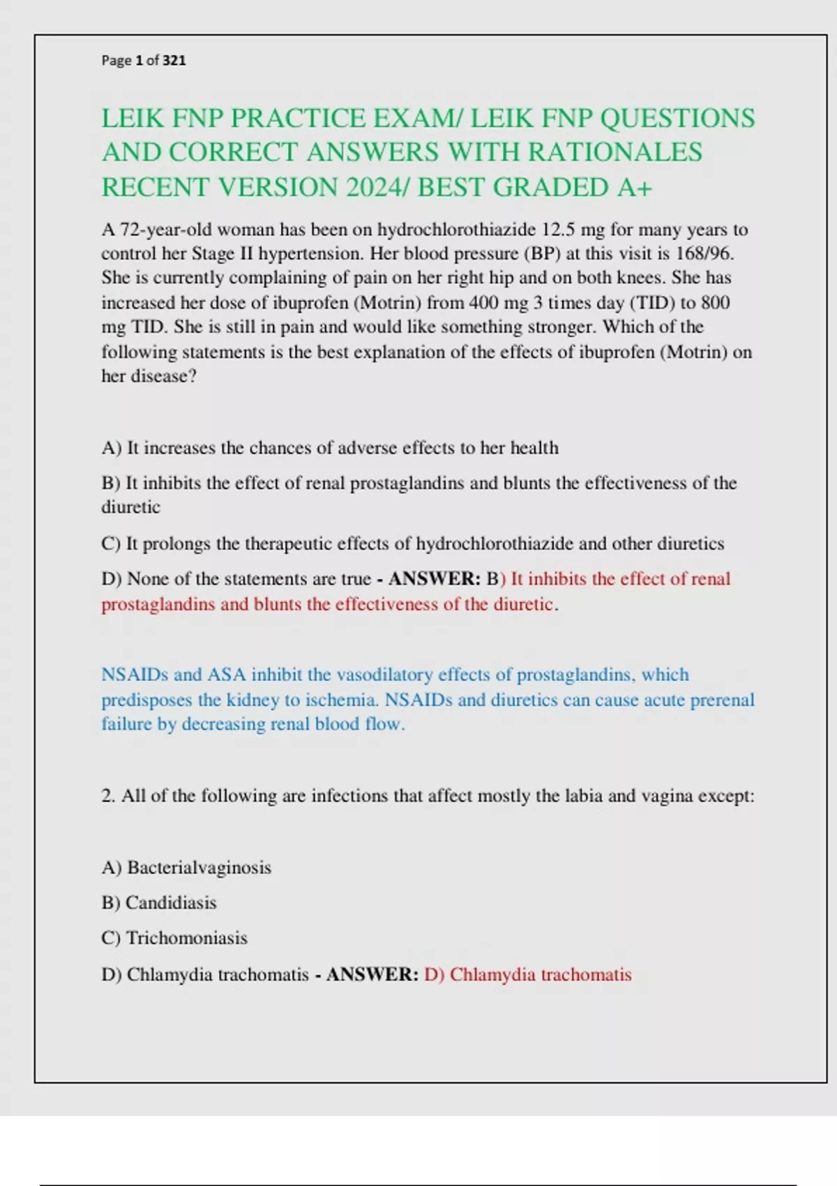 LEIK FNP PRACTICE EXAM/ LEIK FNP QUESTIONS AND CORRECT ANSWERS WITH RATIONALES RECENT VERSION 2024/ BEST GRADED A+ A 72-year-old woman has been on hydrochlorothiazide 12.5 mg for many years to control her Stage II hypertension. Her blood pressure (BP) at this visit is 168/96. She is currently complaining of pain on her right hip and on both knees. She has increased her dose of ibuprofen (Motrin) from 400 mg 3 times day (TID) to 800 mg TID. She is still in pain and would like something stronger. Which of the following statements is the best explanation of the effects of ibuprofen (Motrin) on her disease? A) It increases the chances of adverse effects to her health B) It inhibits the effect of renal prostaglandins and blunts the effectiveness of the diuretic C) It prolongs the therapeutic effects of hydrochlorothiazide and other diuretics D) None of the statements are true - ANSWER: B) It inhibits the effect of renal prostaglandins and blunts the effectiveness of the diuretic. NSAIDs and ASA inhibit the vasodilatory effects of prostaglandins, which predisposes the kidney to ischemia. NSAIDs and diuretics can cause acute prerenal failure by decreasing renal blood flow. 2. All of the following are infections that affect mostly the labia and vagina except: A) Bacterialvaginosis B) Candidiasis C) Trichomoniasis D) Chlamydia trachomatis - ANSWER: D) Chlamydia trachomatis